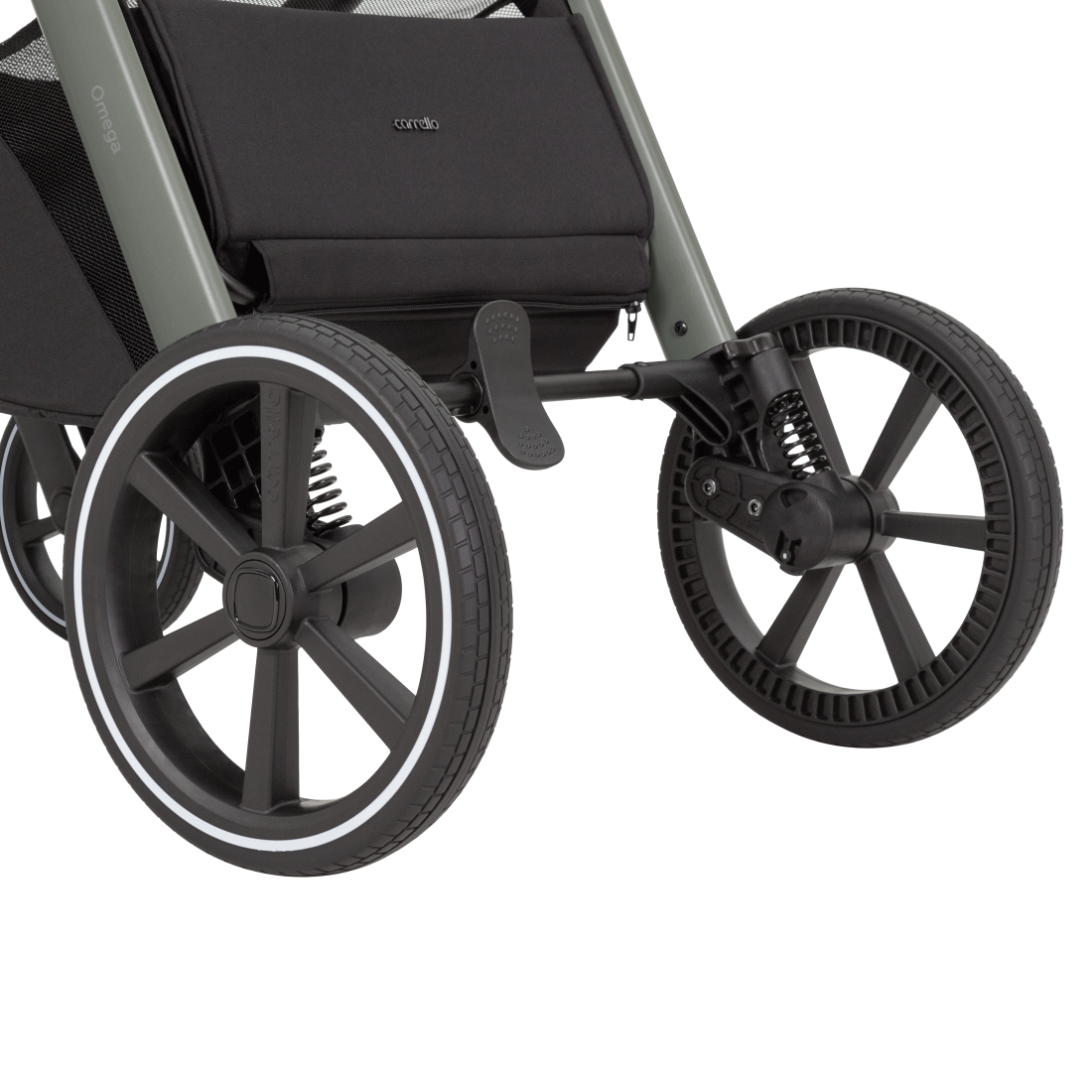 • Передние колёса с автоматической фиксацией в положении «прямо», поворотные на 360°. Все колёса быстросъемные.