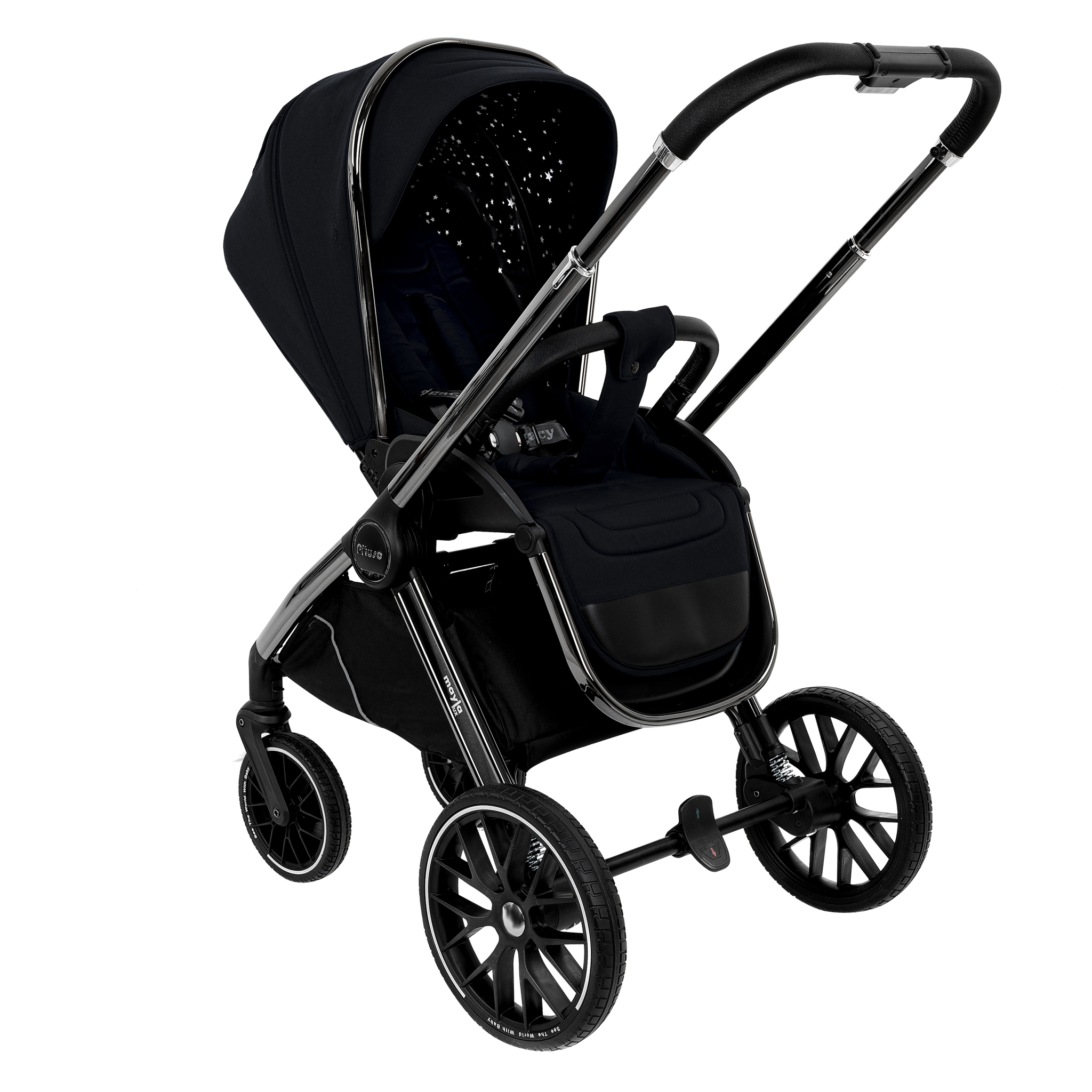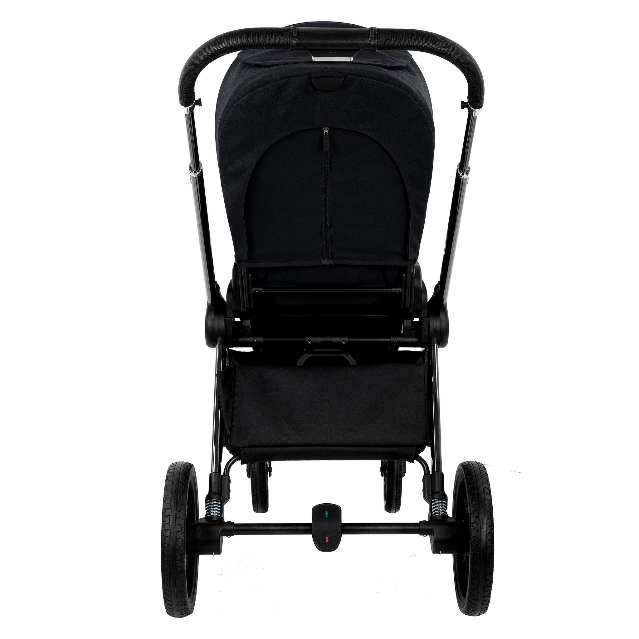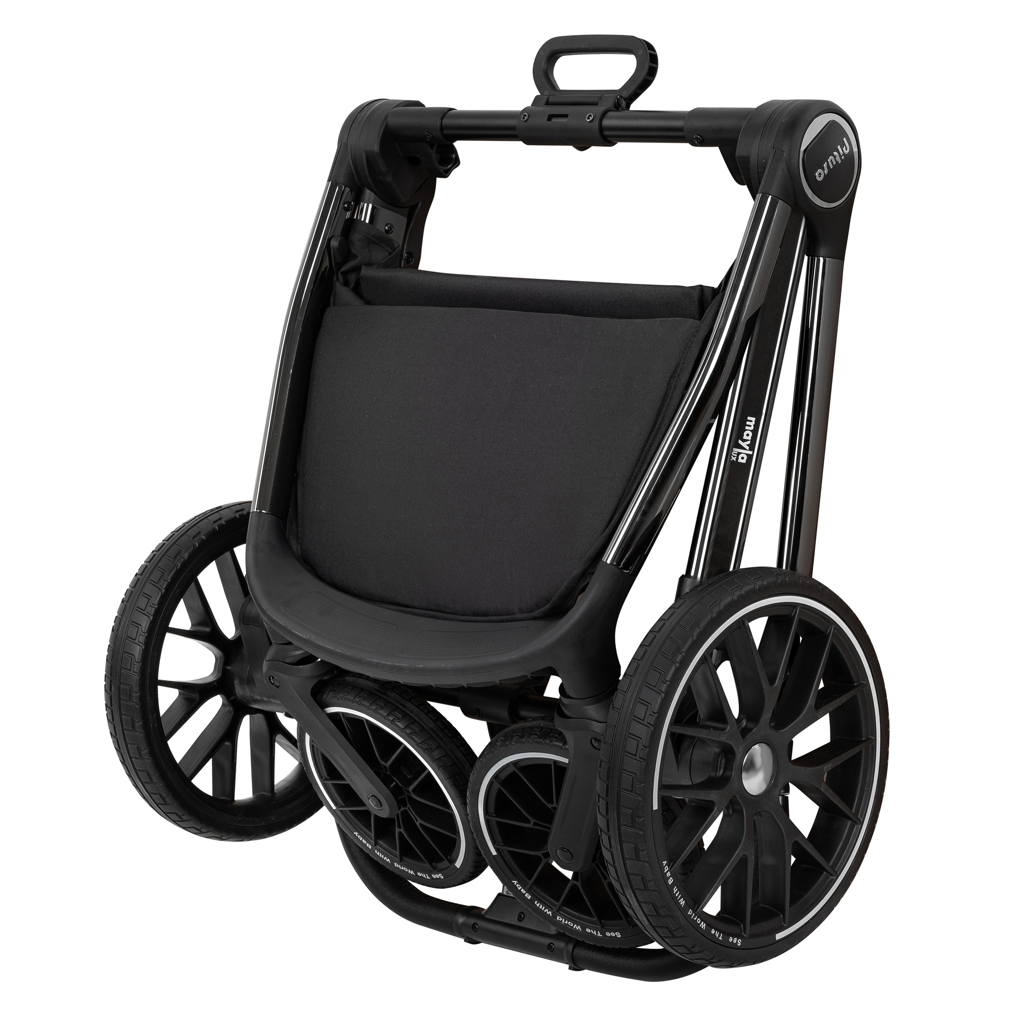 Рама из облегчённого алюминия с покрытием Black Chrome отличается износостойкостью и складывается по типу «книжки». Большие резиновые колёса с индивидуальной амортизацией и поворотными передними колёсами обеспечивают плавность хода и высокую проходимость. Надёжный спаренный тормоз фиксирует коляску на месте.