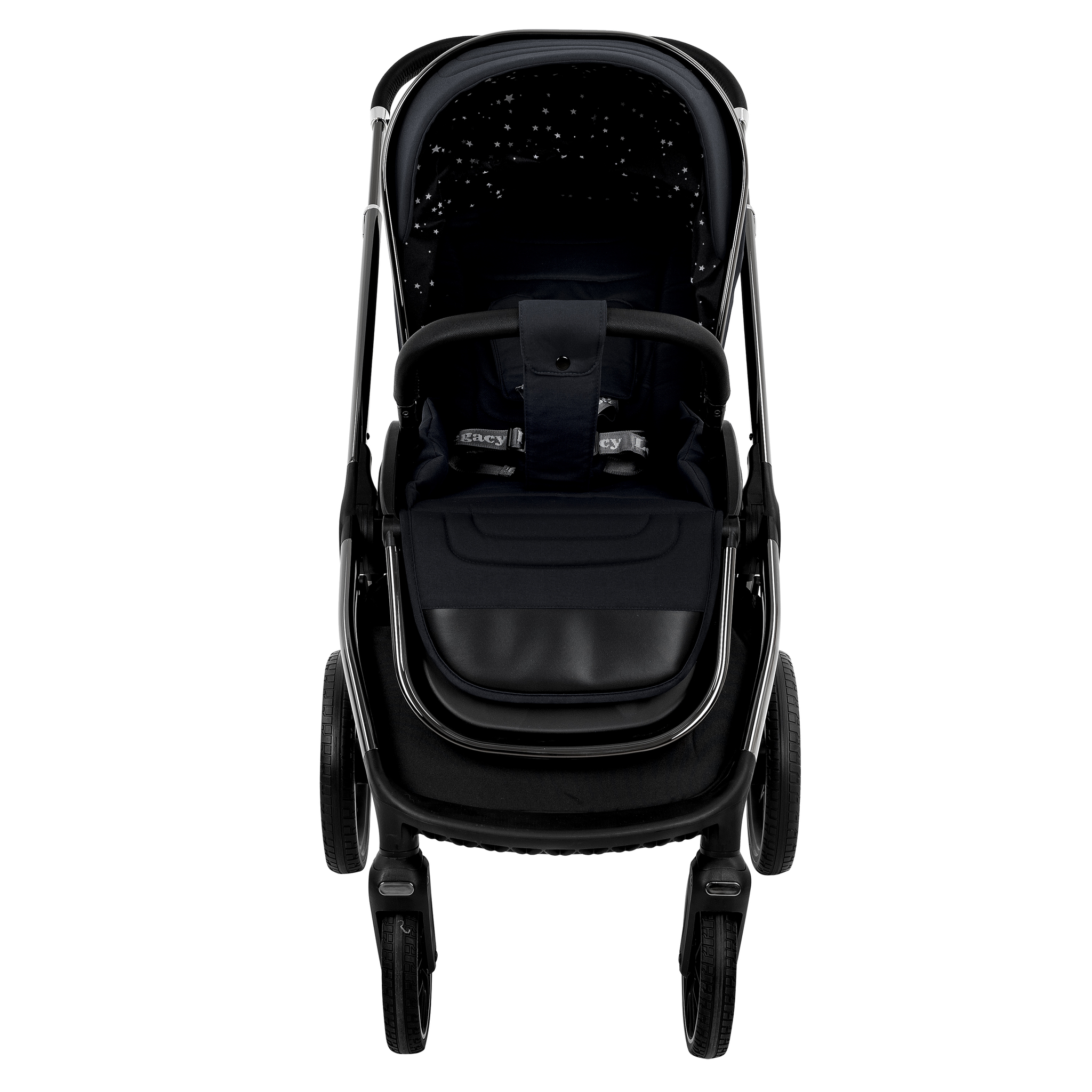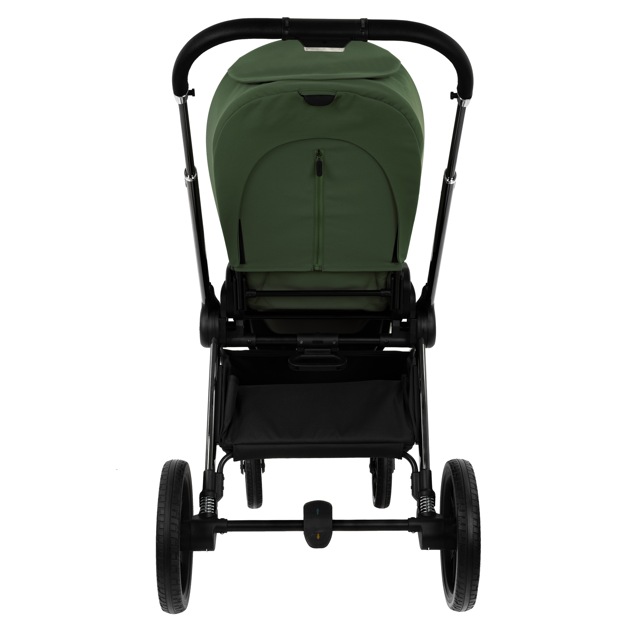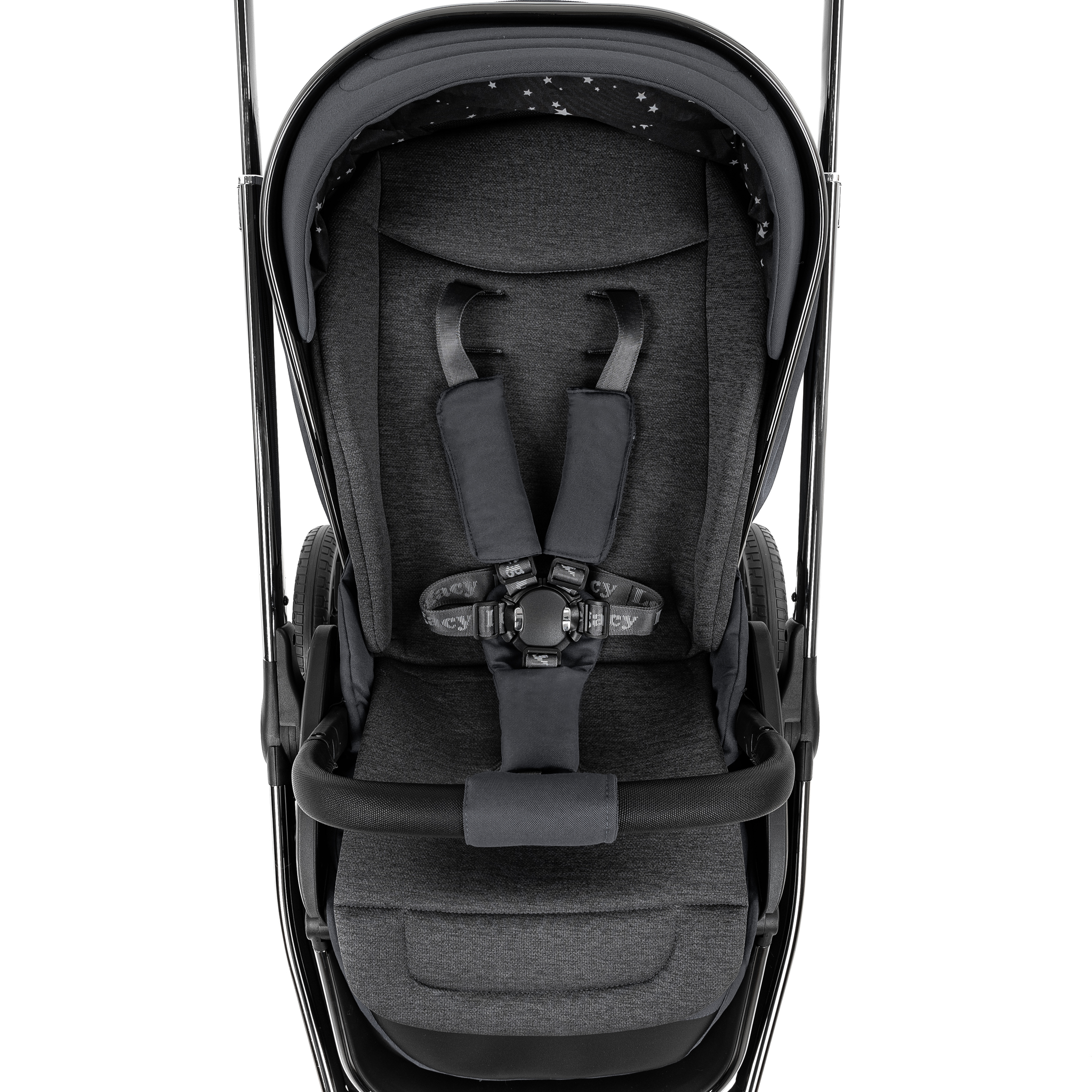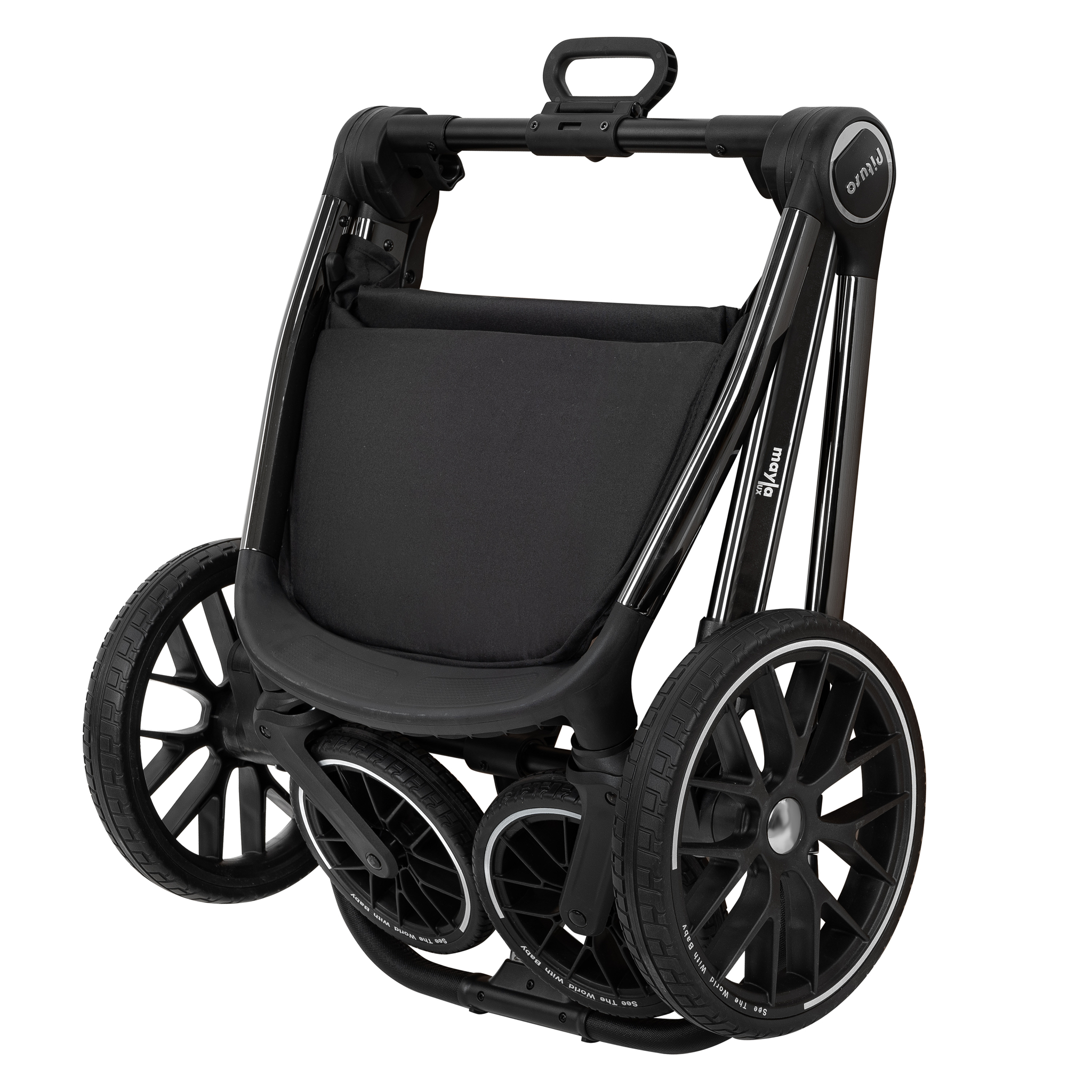 Рама из облегчённого алюминия с покрытием Black Chrome отличается износостойкостью и складывается по типу «книжки». Большие резиновые колёса с индивидуальной амортизацией и поворотными передними колёсами обеспечивают плавность хода и высокую проходимость. Надёжный спаренный тормоз фиксирует коляску на месте.