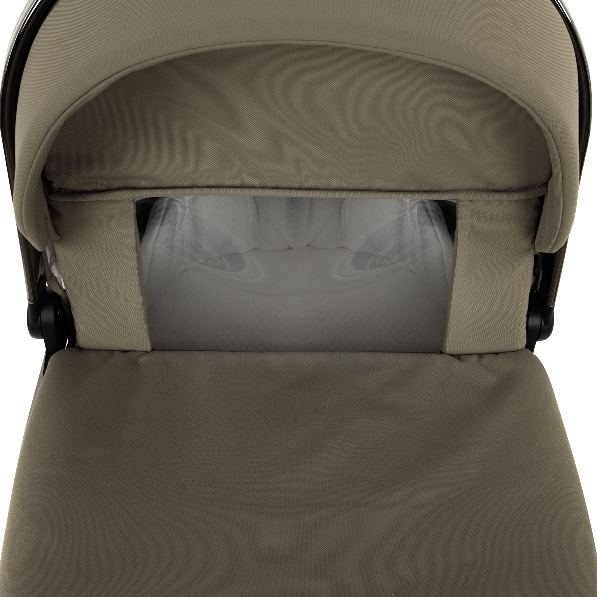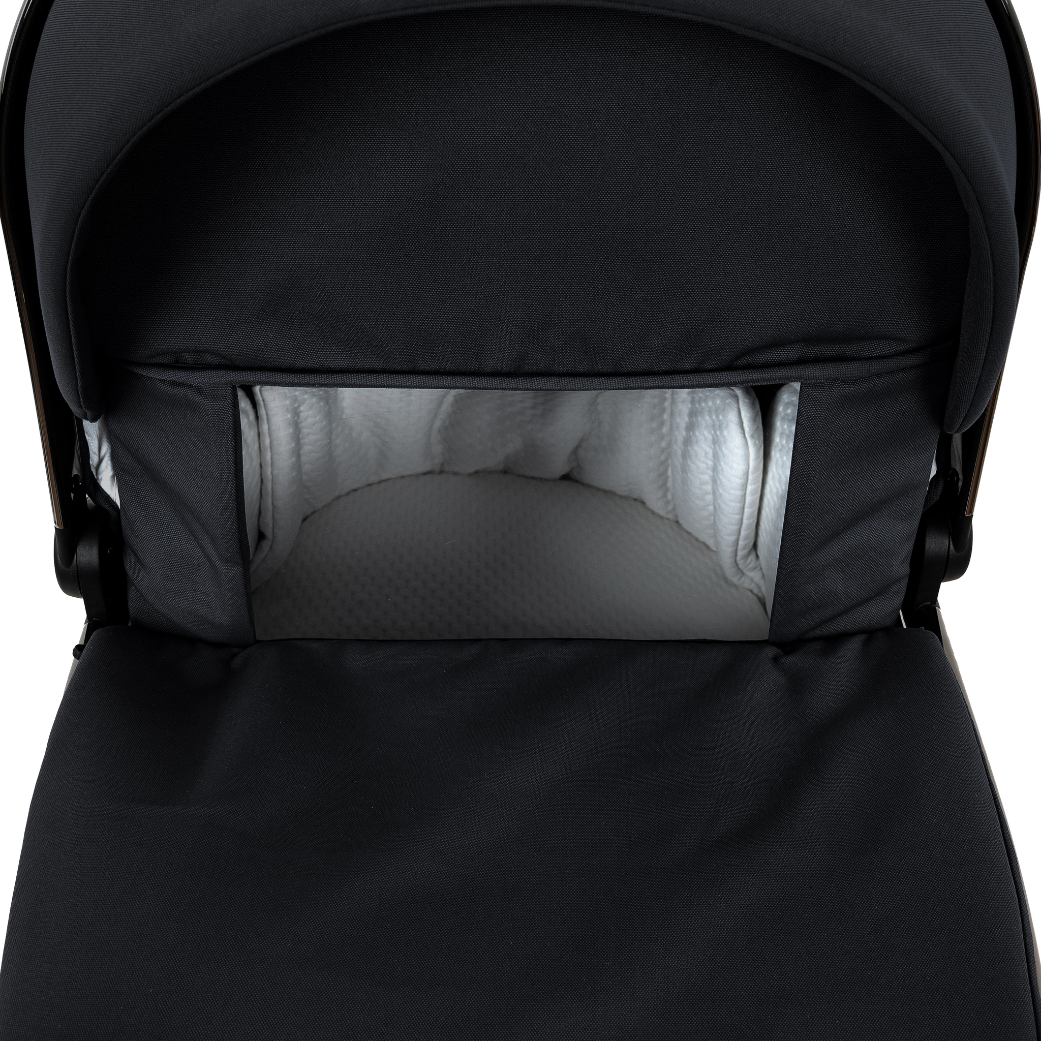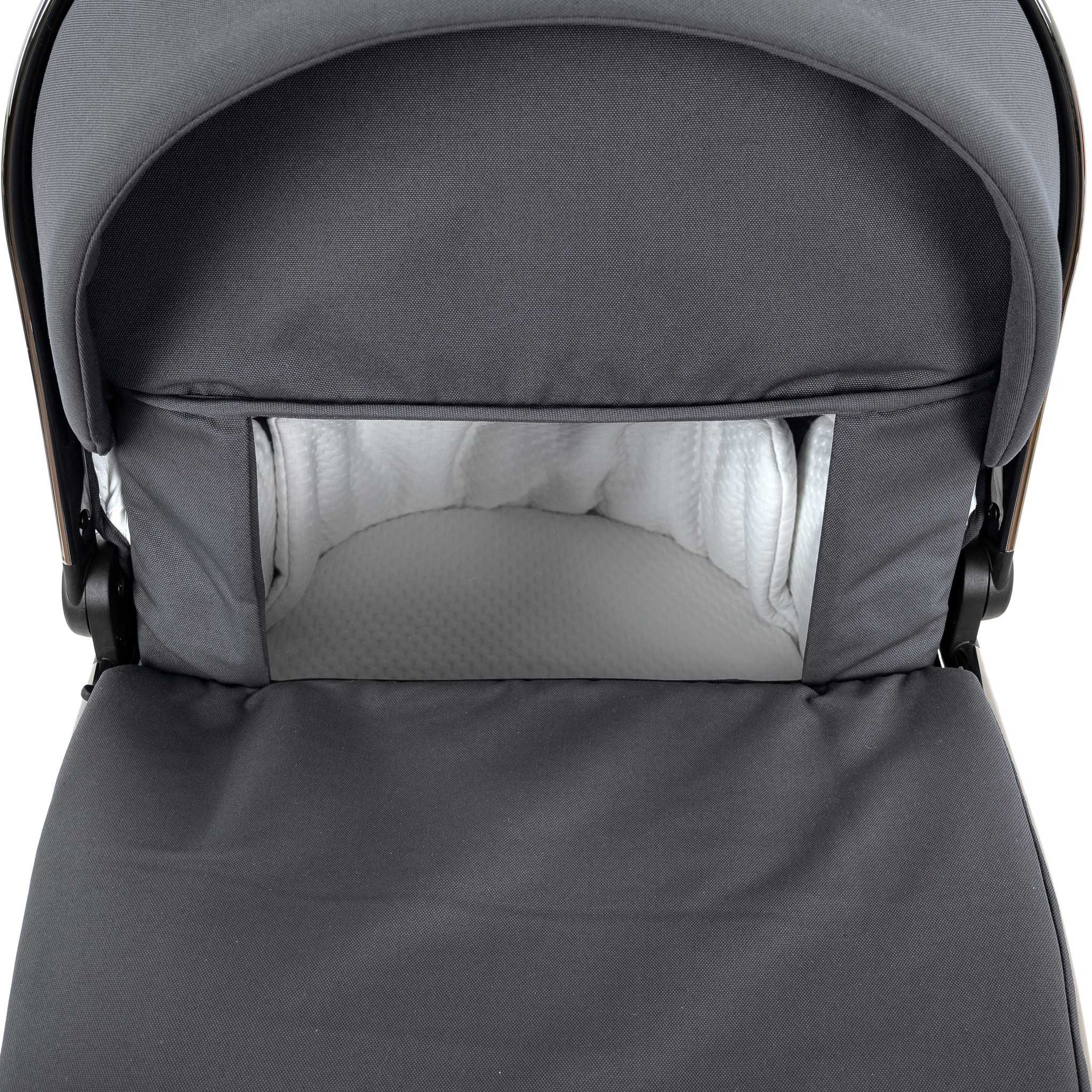 Люлька коляски оснащена системой вентиляции для регулировки температуры в жаркую погоду и многослойным утеплённым корпусом для защиты в холодное время года. Ортопедический матрас и механизм регулировки спинки обеспечивают комфортное положение малыша. Лёгкое снятие с шасси реализовано через систему Memory Button.