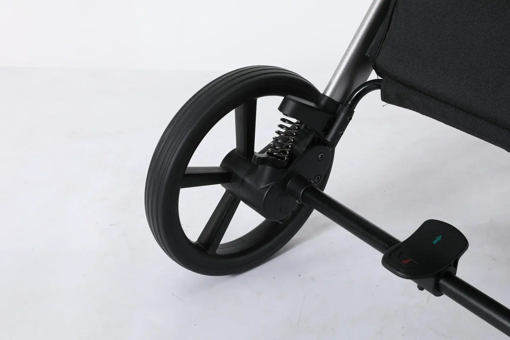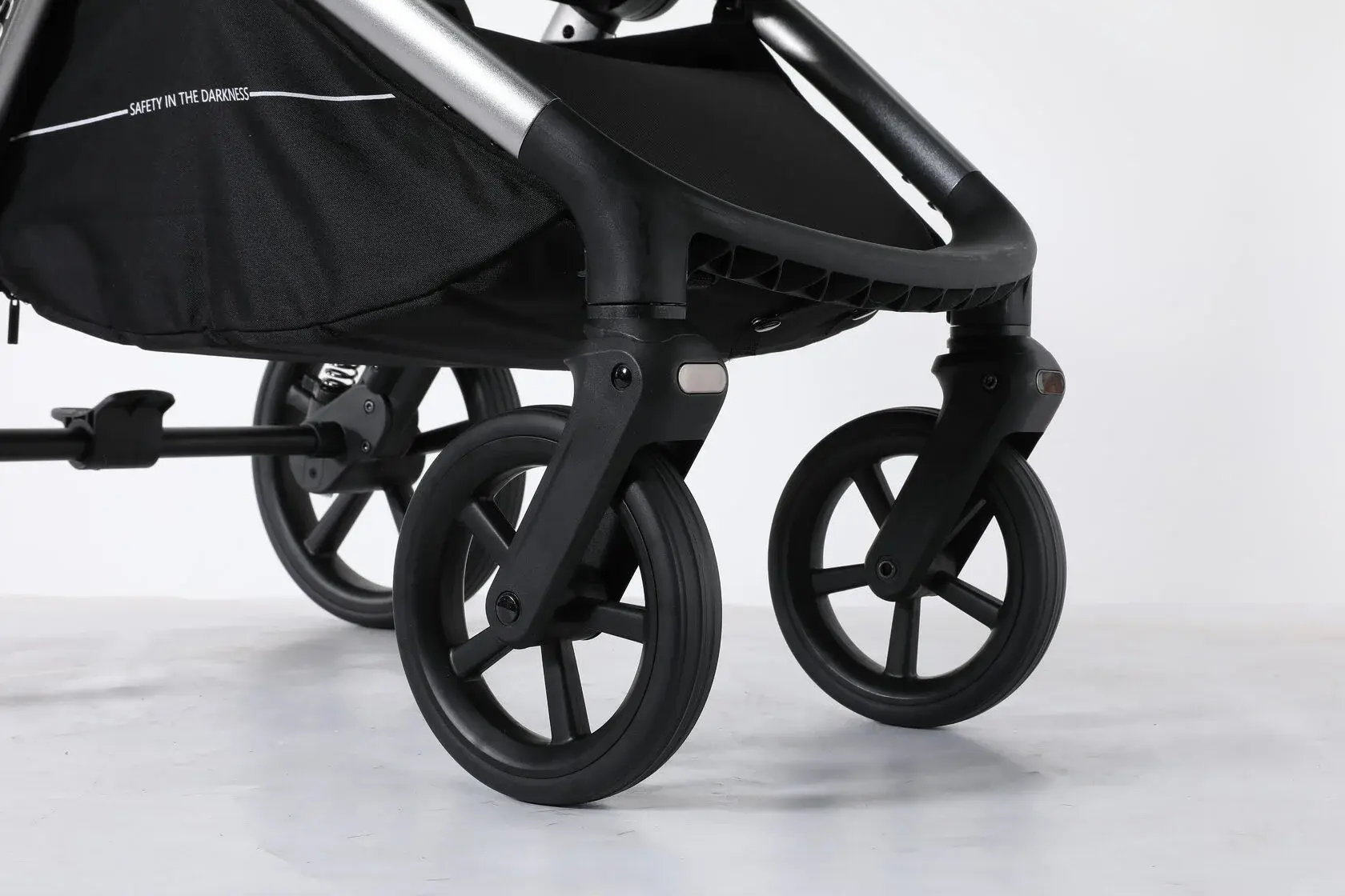 Лёгкая хромированная рама сочетает прочность и маневренность. Телескопическая ручка с регулировкой по высоты и отделкой из эко-кожи обеспечивает удобство управления. Амортизационная система сглаживает неровности дороги, обеспечивая плавность хода. Колесная база доступна в различных цветовых вариантах.