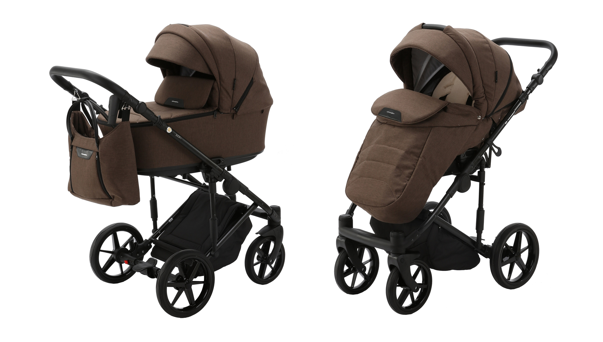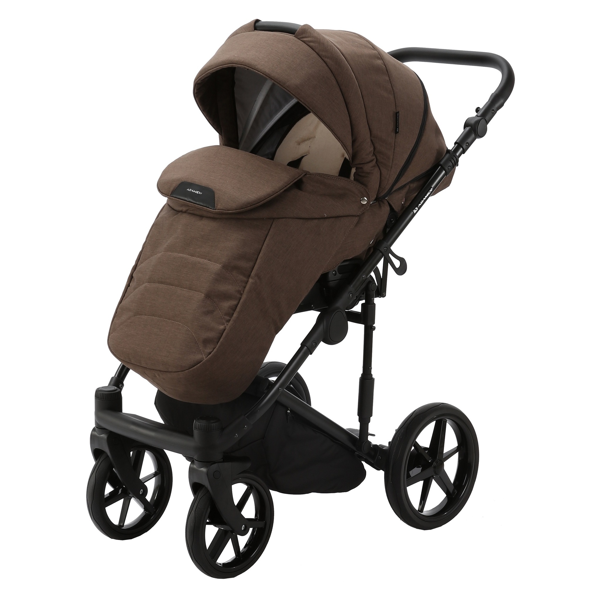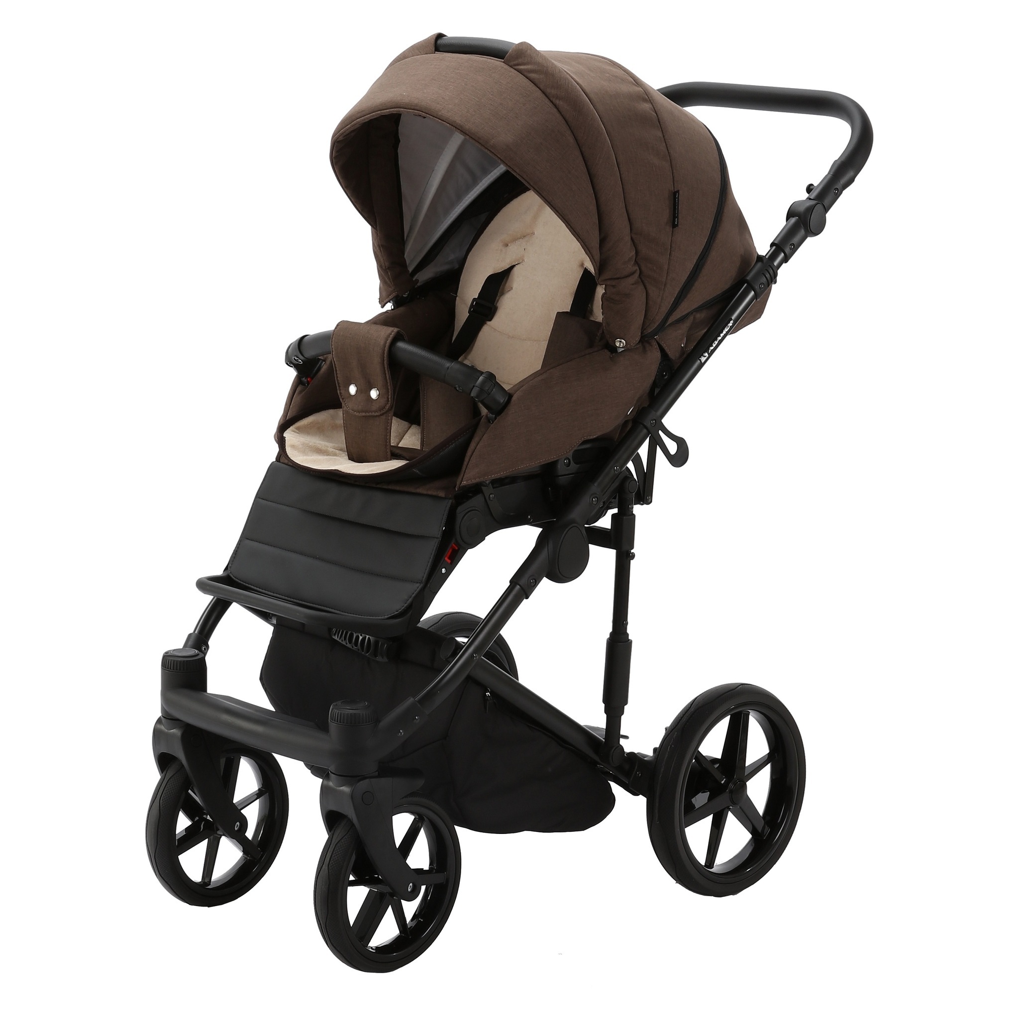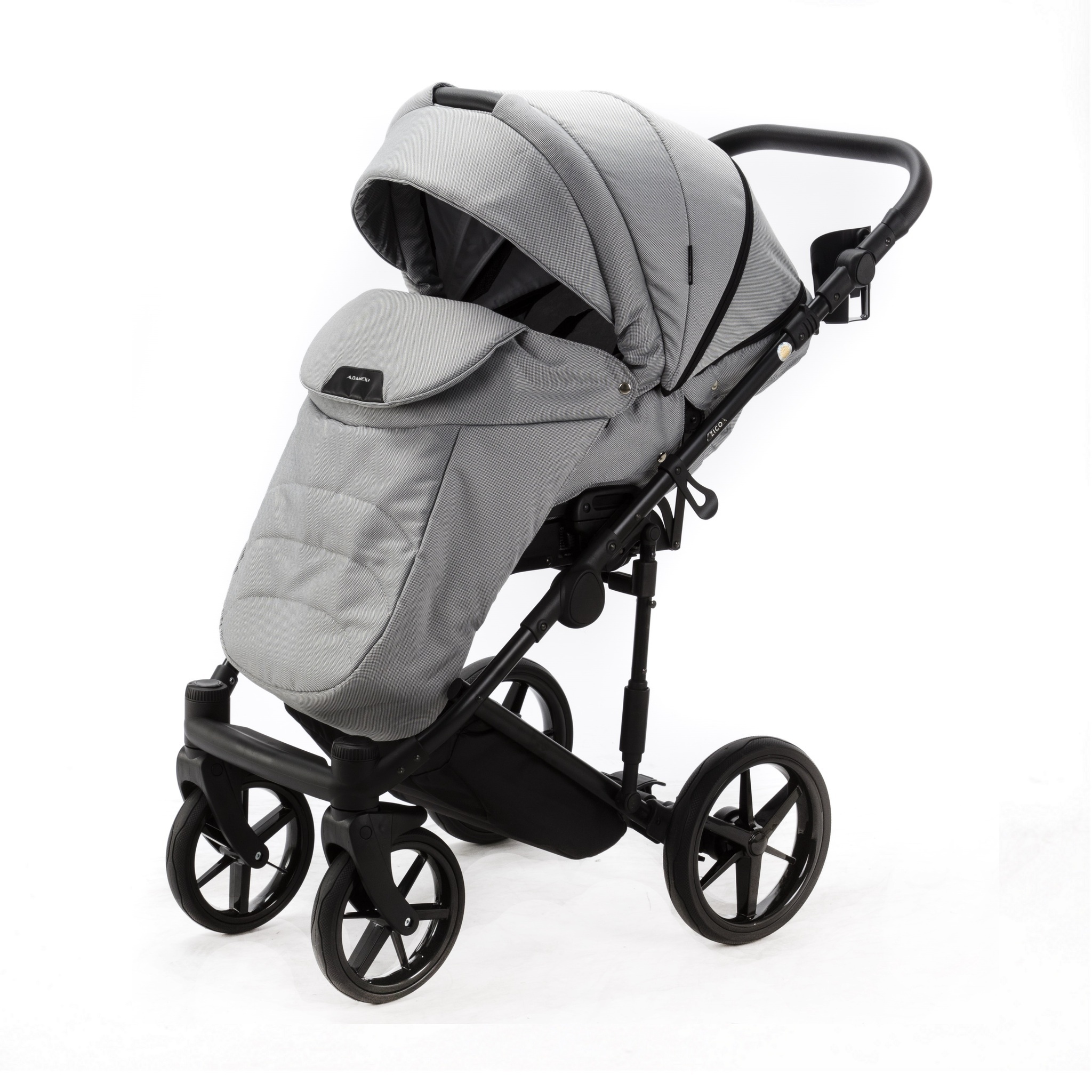 У коляски Adamex Zico эргономичный прогулочный блок. Капюшон надежно укроет ребенка от ветра и осадков. Также в капюшоне предусмотрена дополнительная скрытая вставка с сеткой для проветривания. Спинка прогулочного блока регулируется в 4 положениях от горизонтального до положения сидя. В комплекте с прогулочным блоком идет мягкий вкладыш. За безопасность отвечают 5-ти точечные ремни безопасности. Обшитый эко-кожей поручень (бампер) съемный и откидной. Ограничитель между ножек не позволит ребенку сползать вперед. Подножка у блока регулируется по наклону.