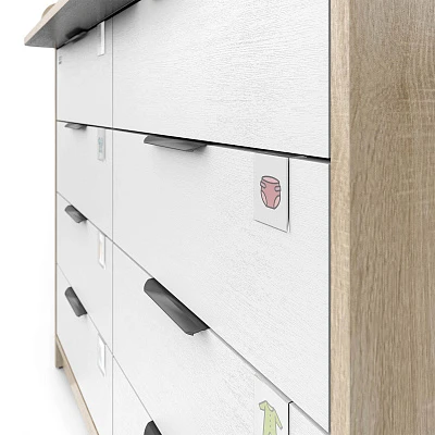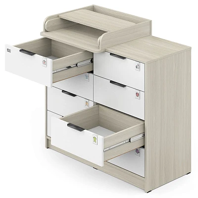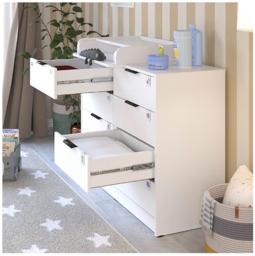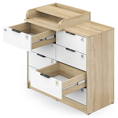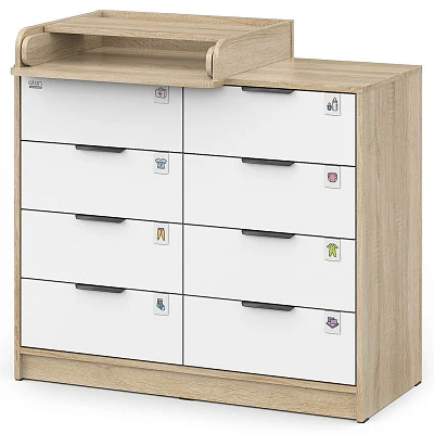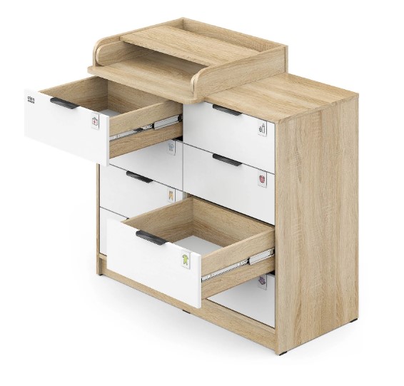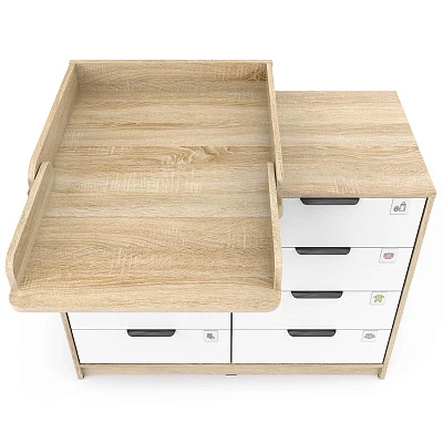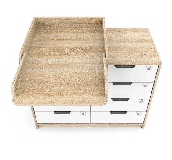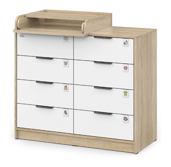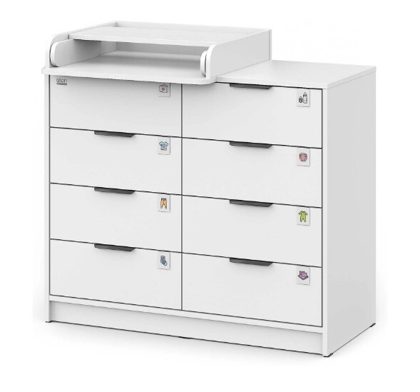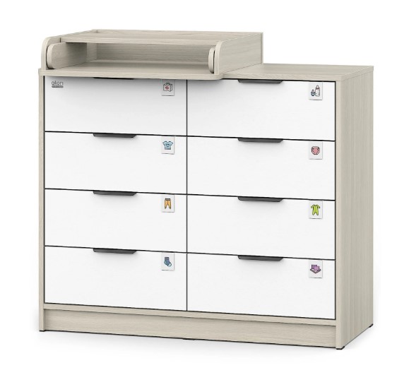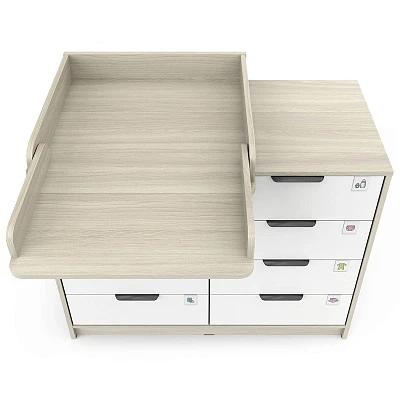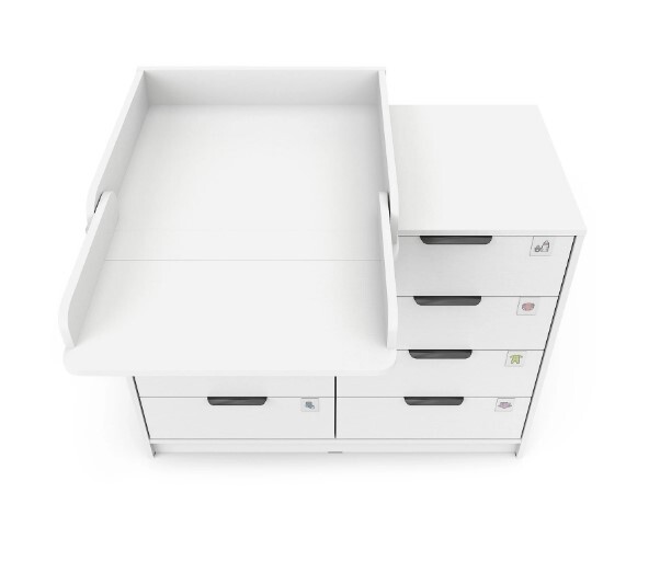 Откройте для себя комфорт и функциональность пеленального комода Zeus! Восьми выдвигающихся ящичков хватит для хранения всего необходимого, а съемная пеленальная поверхность регулируется одним движением – закрепляйте ее слева, справа либо посередине мебели при помощи надежных металлических фиксаторов. Удобно, практично и эстетично – ваш идеальный помощник в уходе за маленьким чудом!