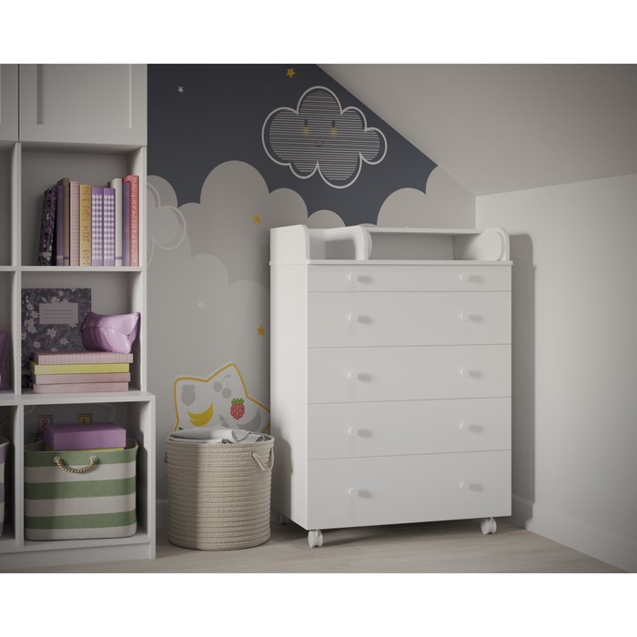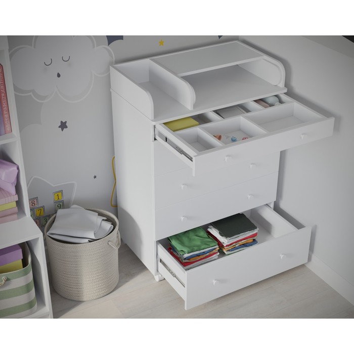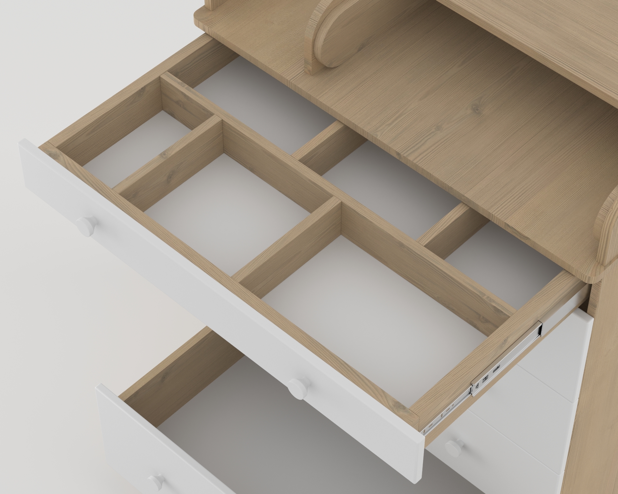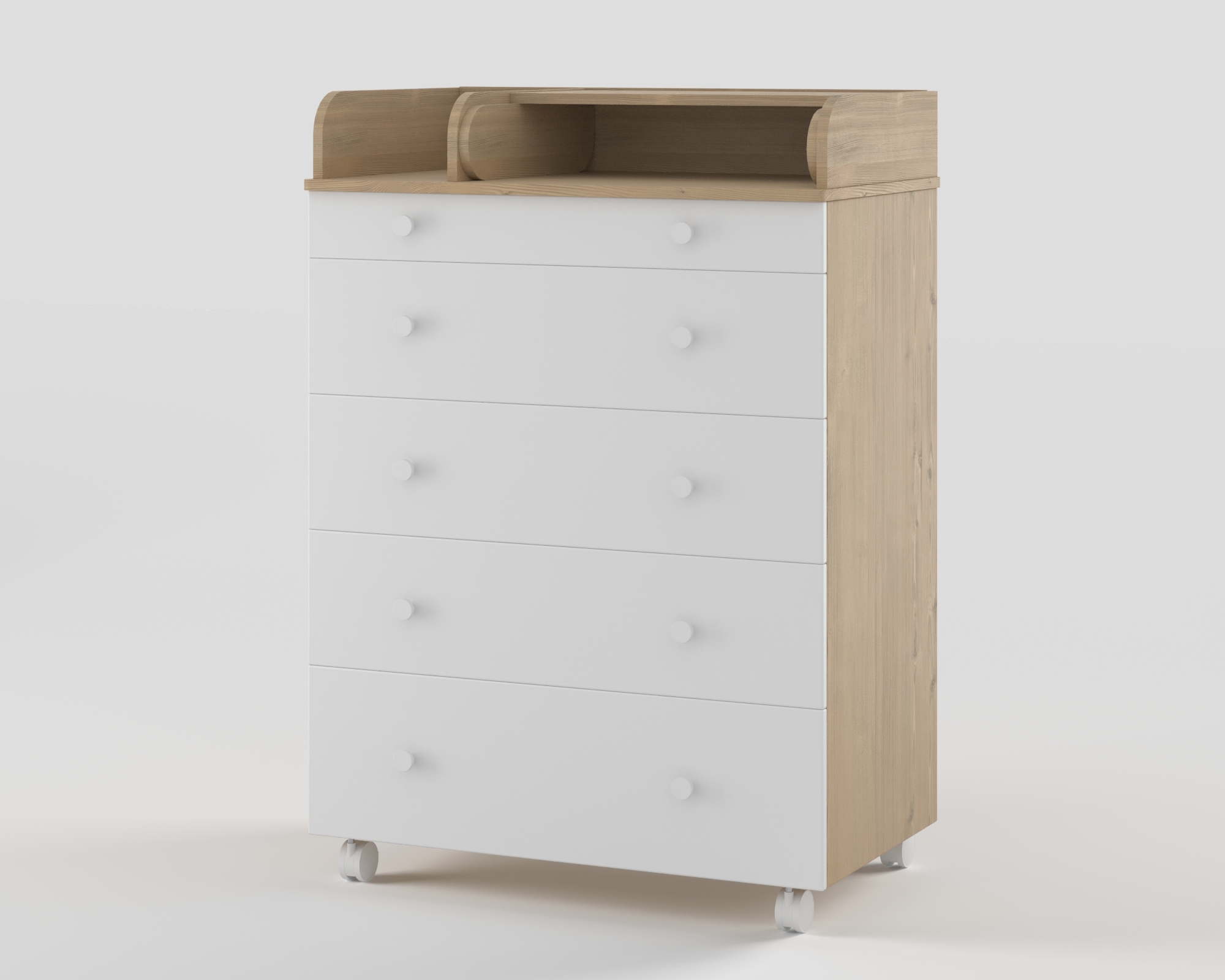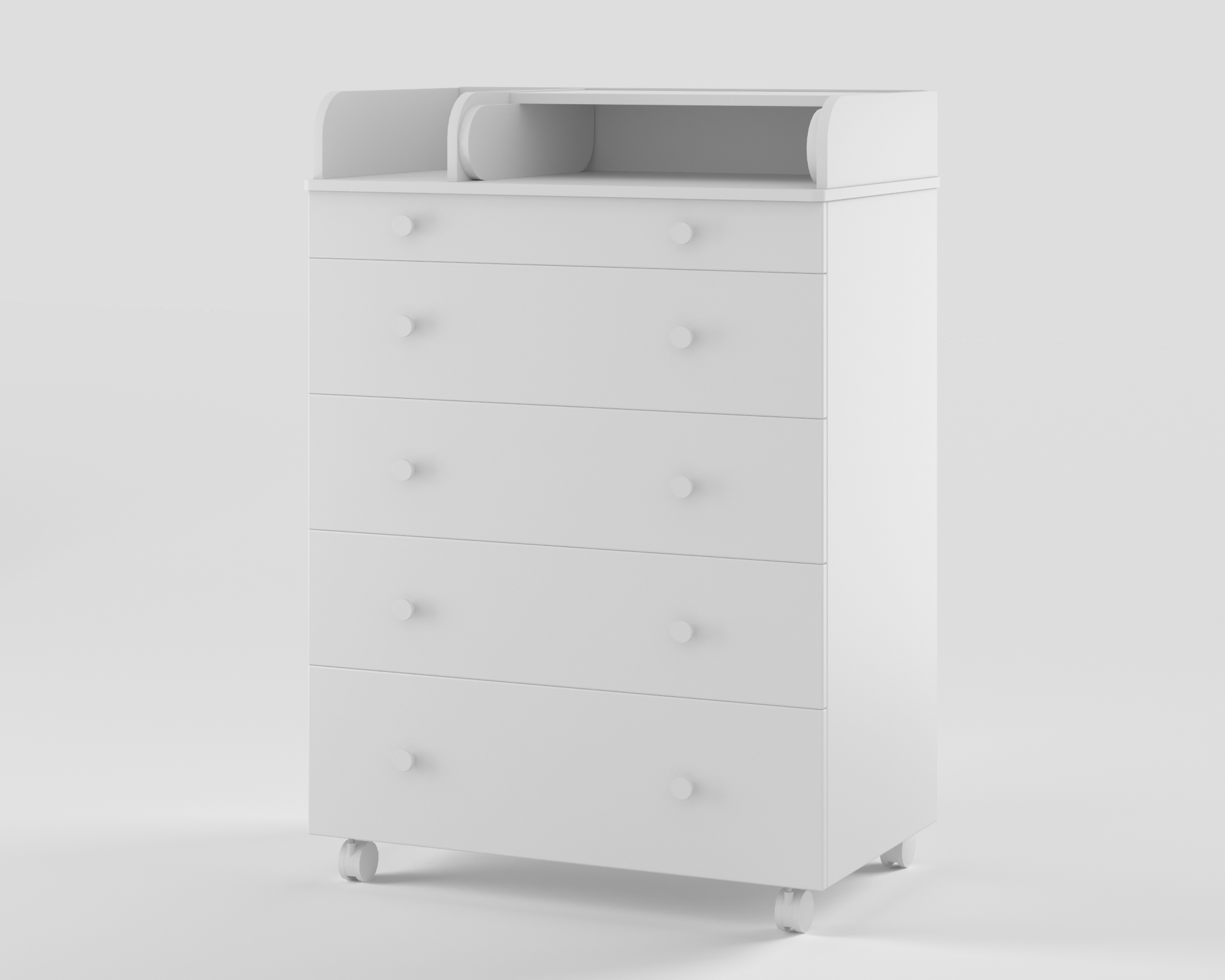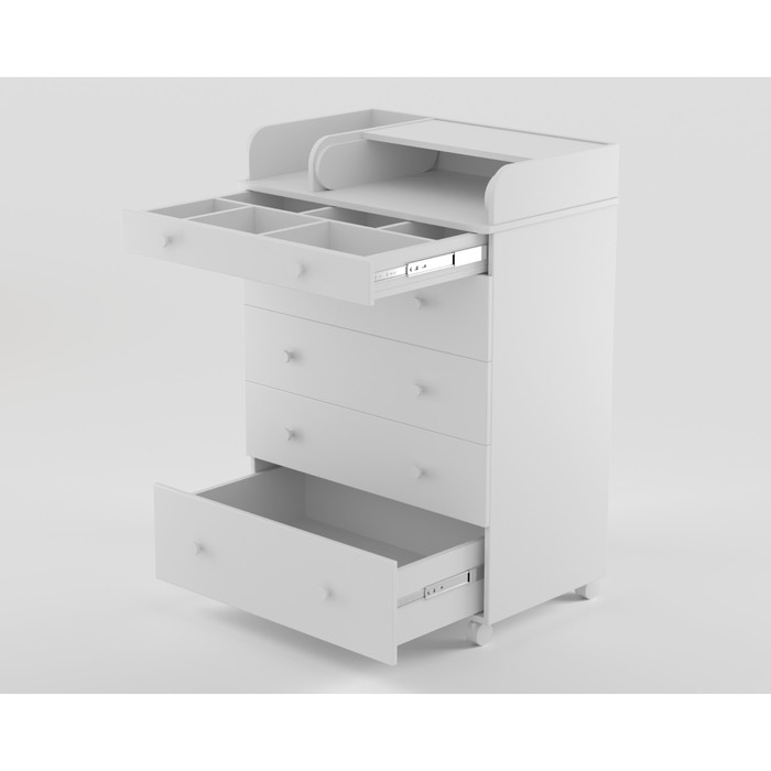 Модный детский комод оснащен удобными ящиками с шариковыми направляющими и практичным органайзером вверху для мелкой атрибутики. Закругленные края обеспечивают безопасность ребенка. Пеленальная поверхность легко трансформируется в полку либо убирается совсем, превращая изделие обратно в стильный классический комод. Удобно, надежно, красиво!