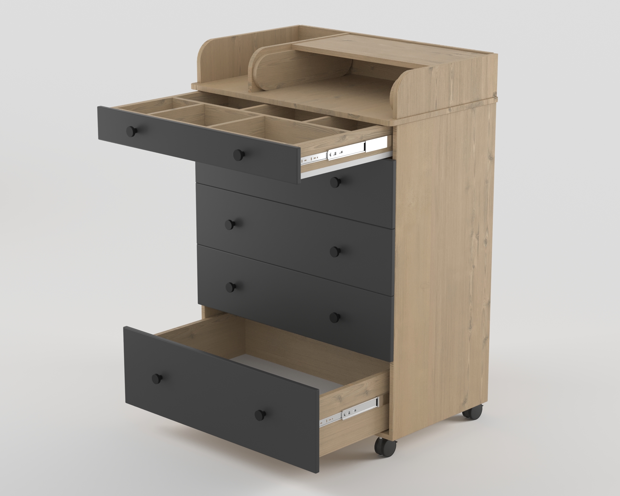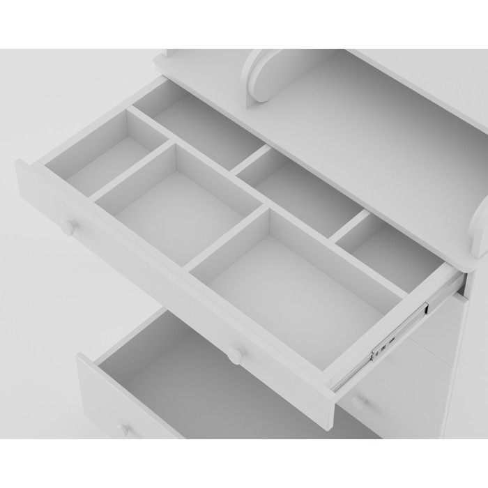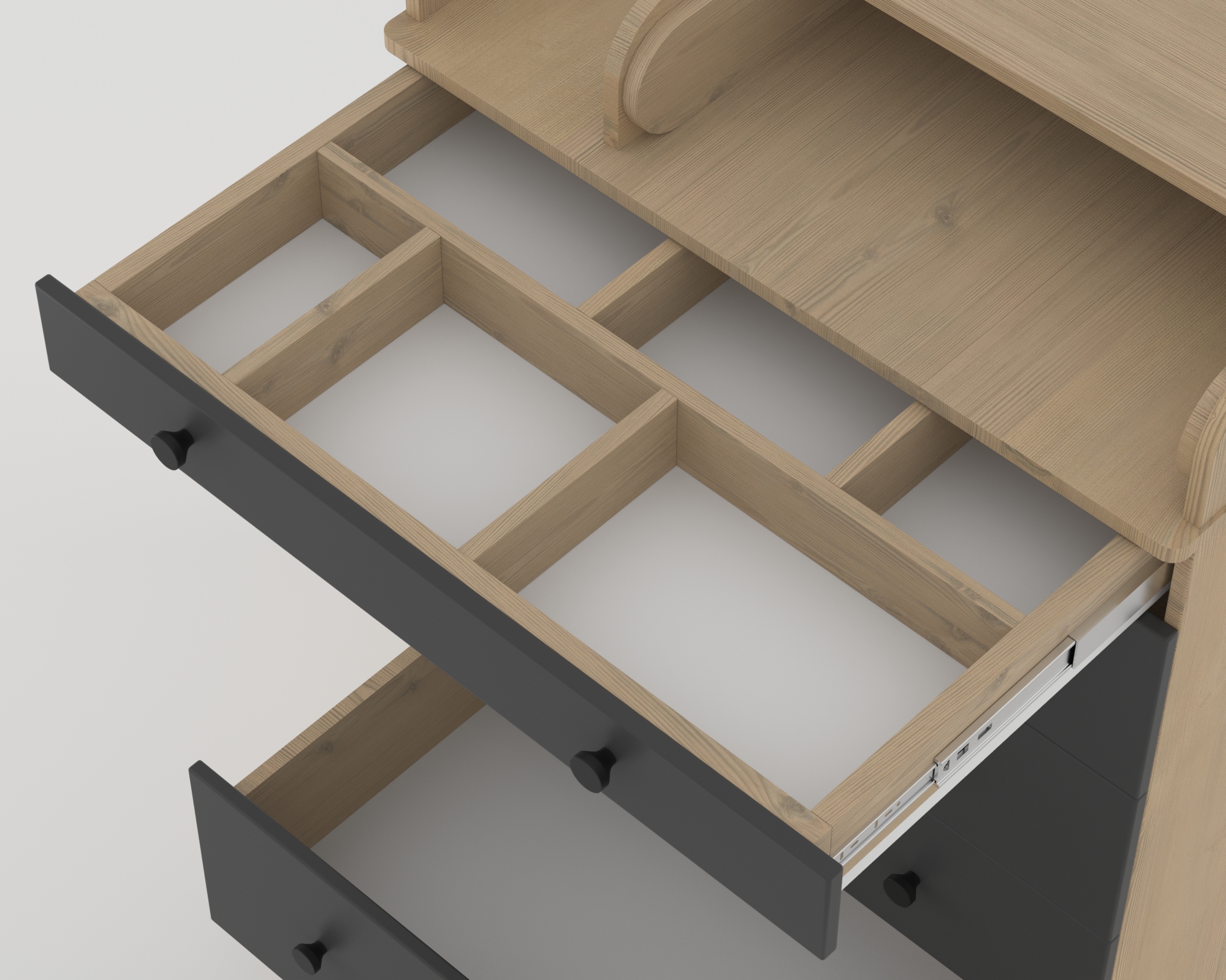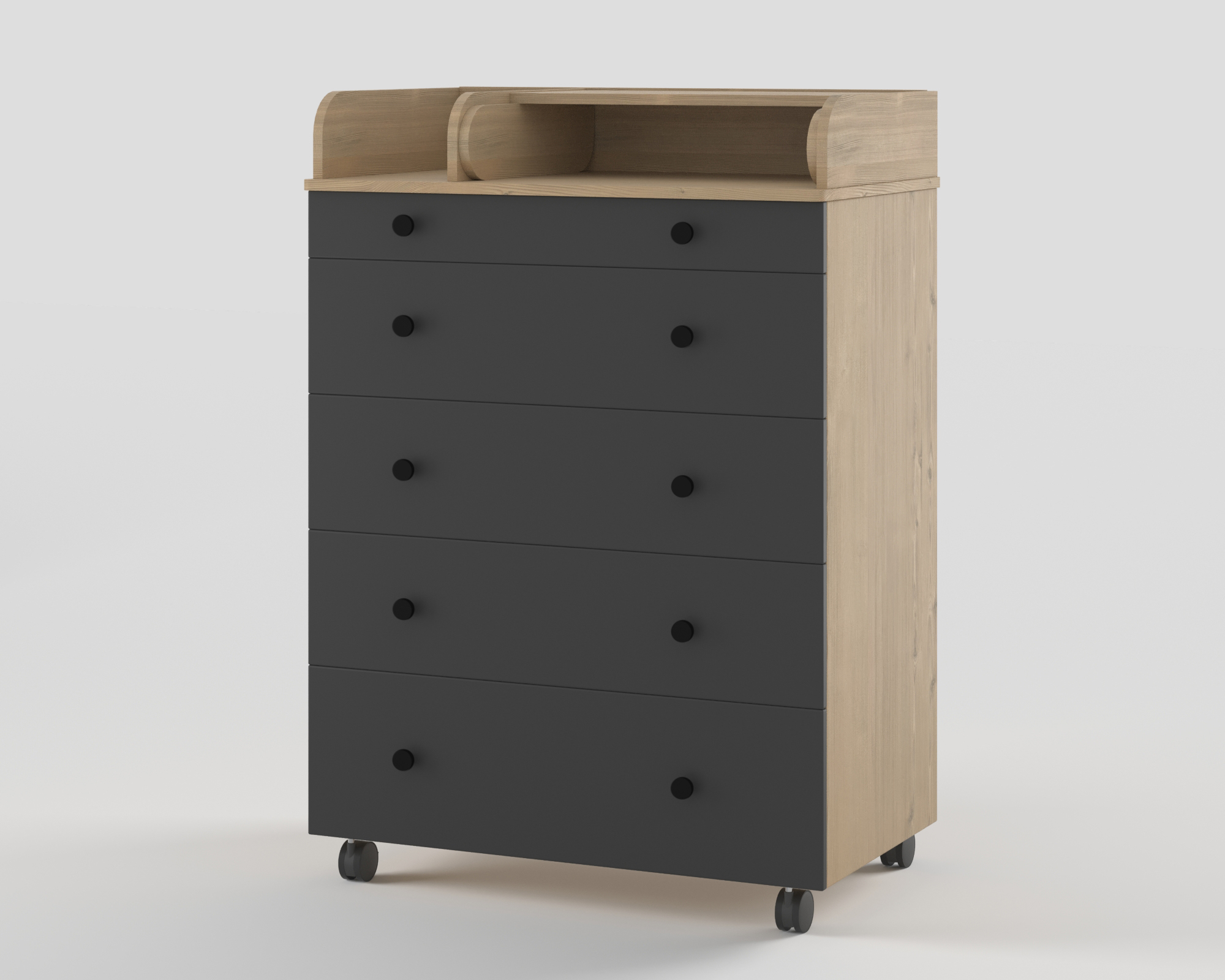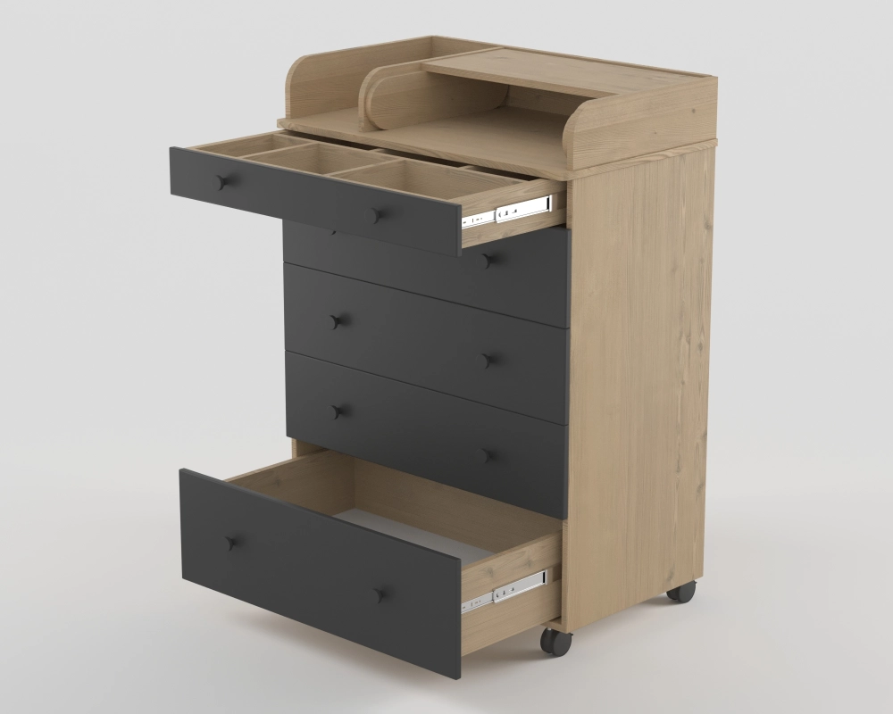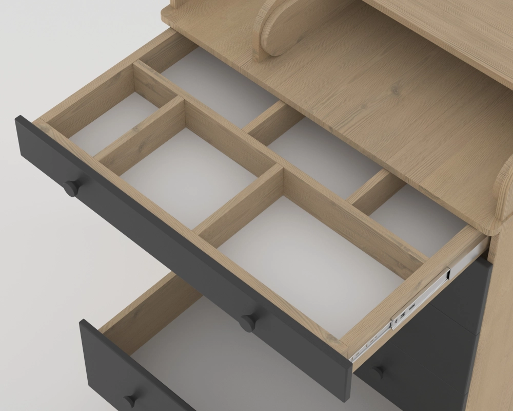 Модный детский комод оснащен удобными ящиками с шариковыми направляющими и практичным органайзером вверху для мелкой атрибутики. Закругленные края обеспечивают безопасность ребенка. Пеленальная поверхность легко трансформируется в полку либо убирается совсем, превращая изделие обратно в стильный классический комод. Удобно, надежно, красиво!