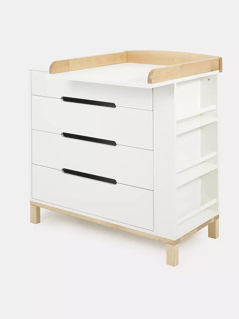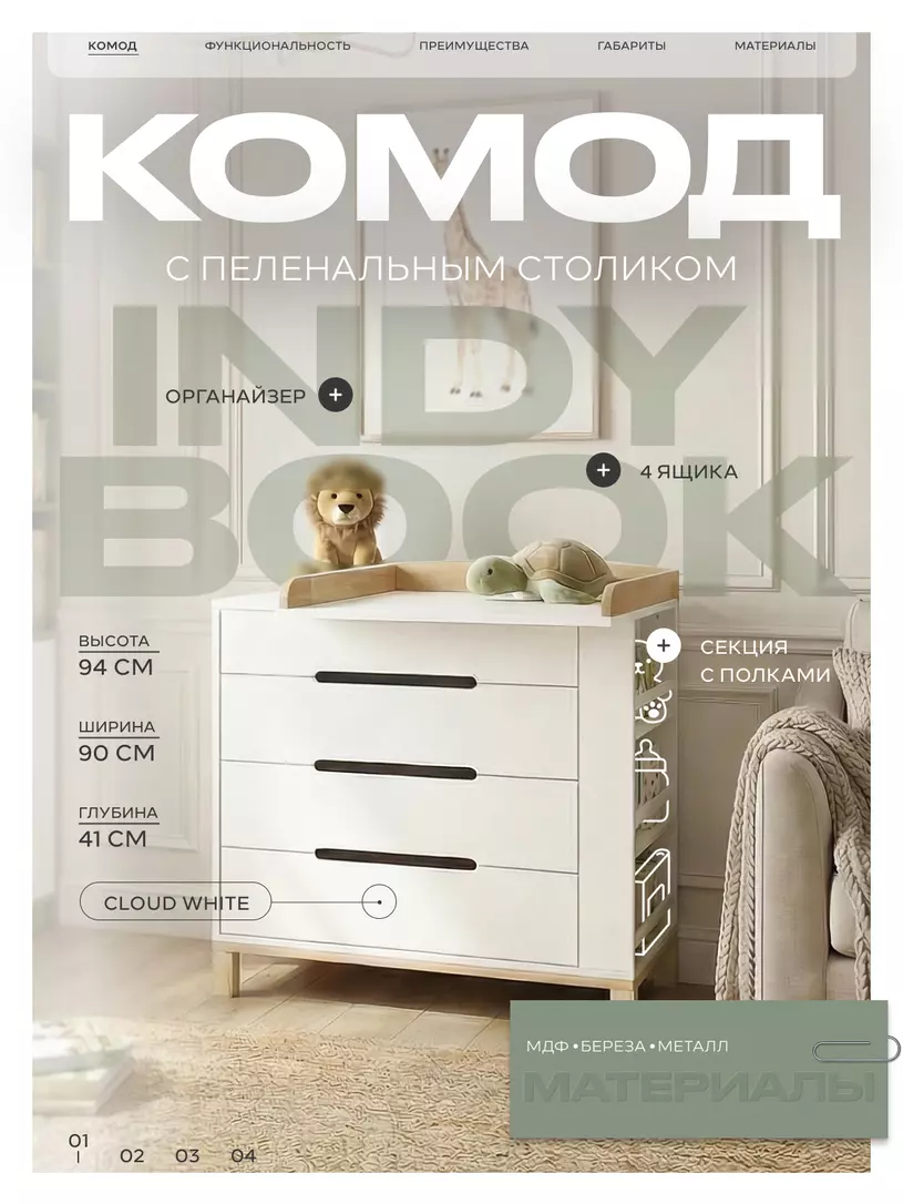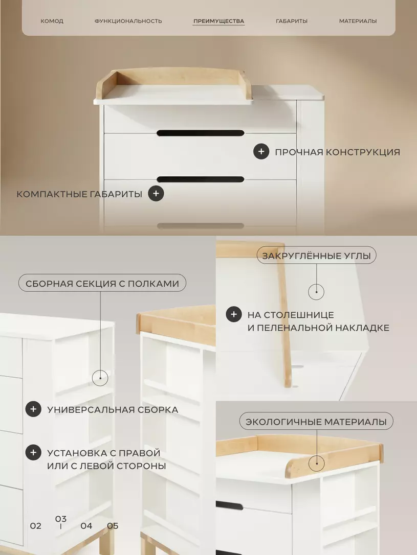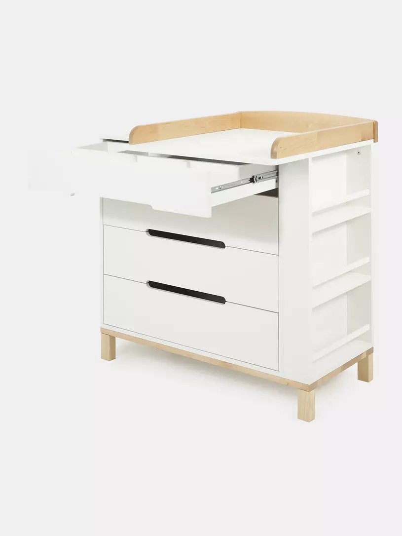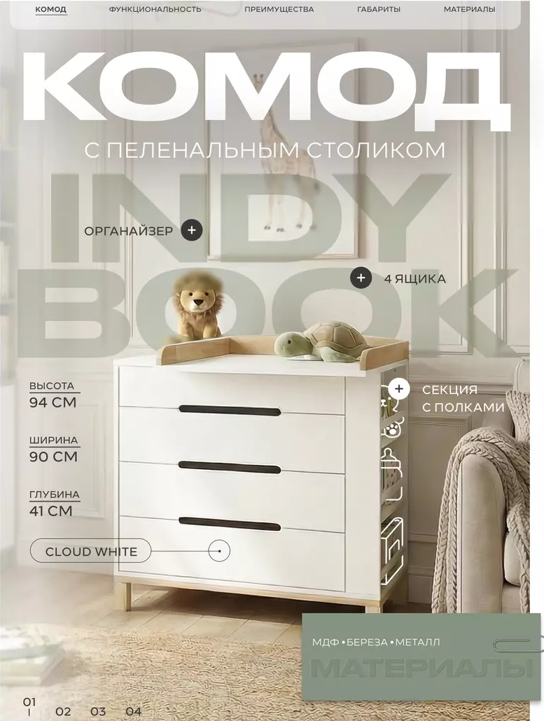 Пеленальный комод INDY BOOK – воплощение стиля экоминимализм! Современные белые акценты, натуральные деревянные элементы и оригинальные вырезы вместо стандартных ручек придают мебели изысканность и уютную атмосферу. Телескопические направляющие повышенной прочности, безопасные округлые уголки и удобные секции для хранения книг и мелочей делают этот комод функциональным помощником каждого родителя.