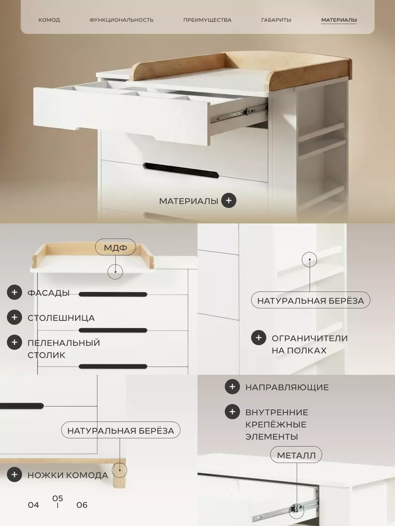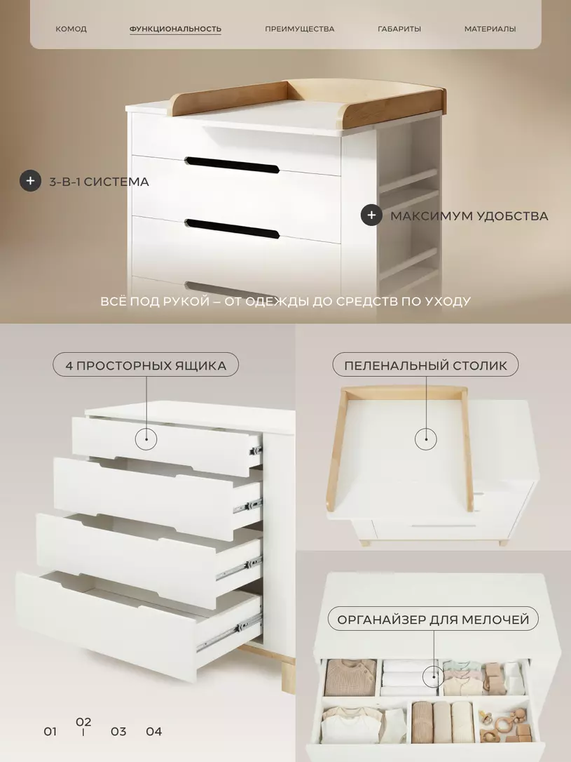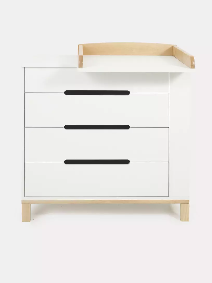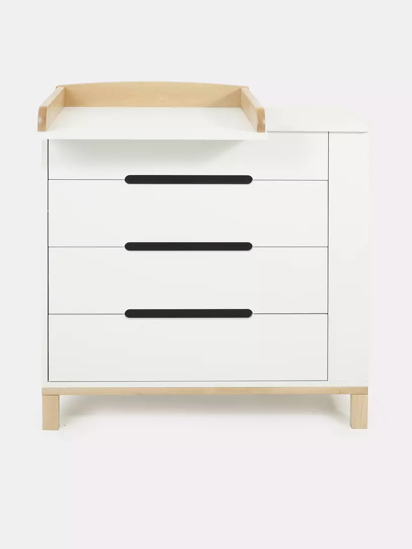 Пеленальный комод INDY BOOK – воплощение стиля экоминимализм! Современные белые акценты, натуральные деревянные элементы и оригинальные вырезы вместо стандартных ручек придают мебели изысканность и уютную атмосферу. Телескопические направляющие повышенной прочности, безопасные округлые уголки и удобные секции для хранения книг и мелочей делают этот комод функциональным помощником каждого родителя.