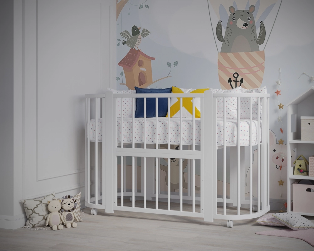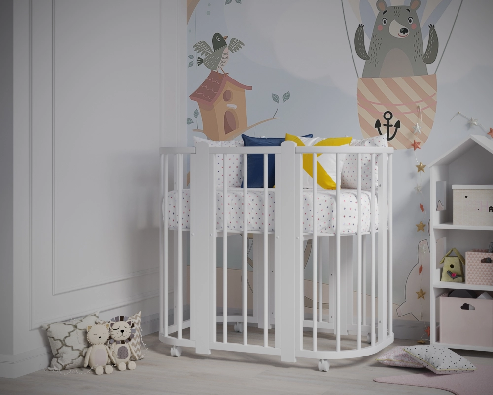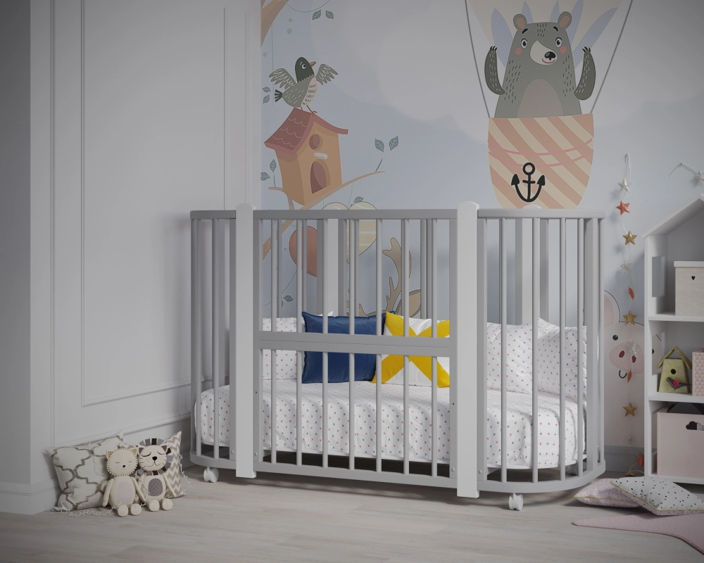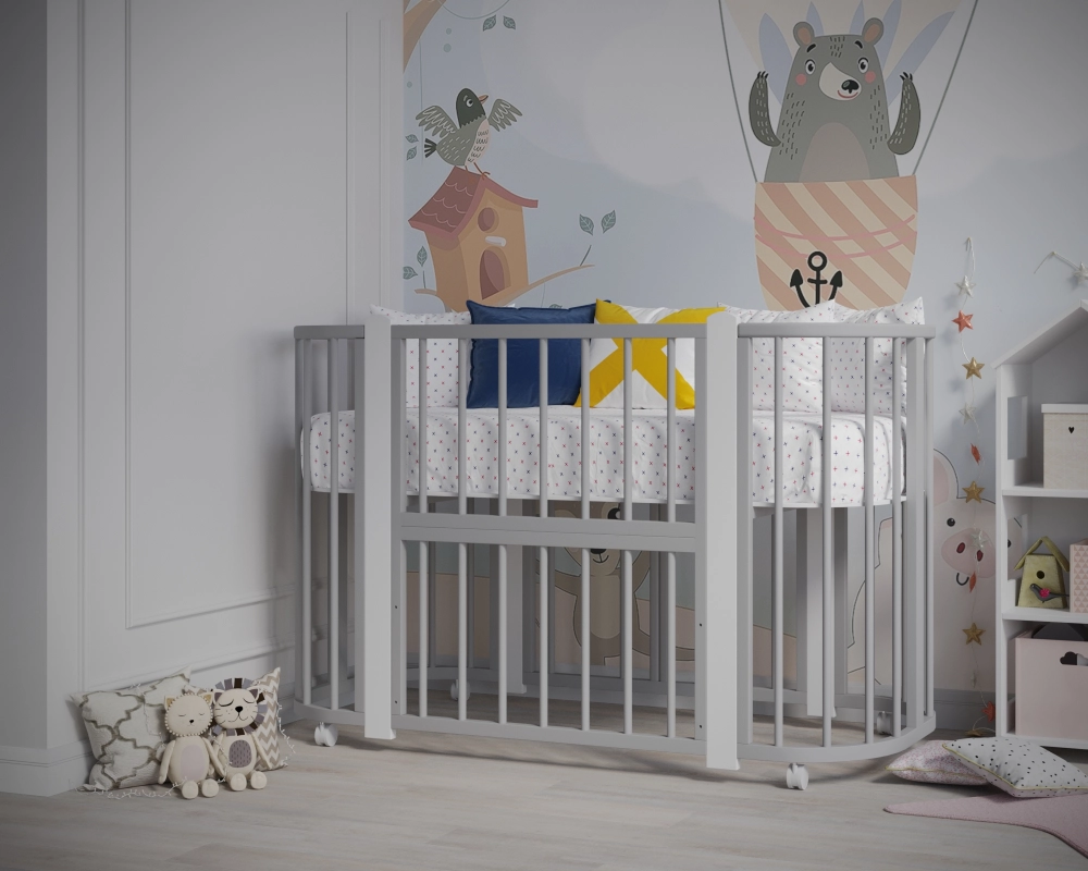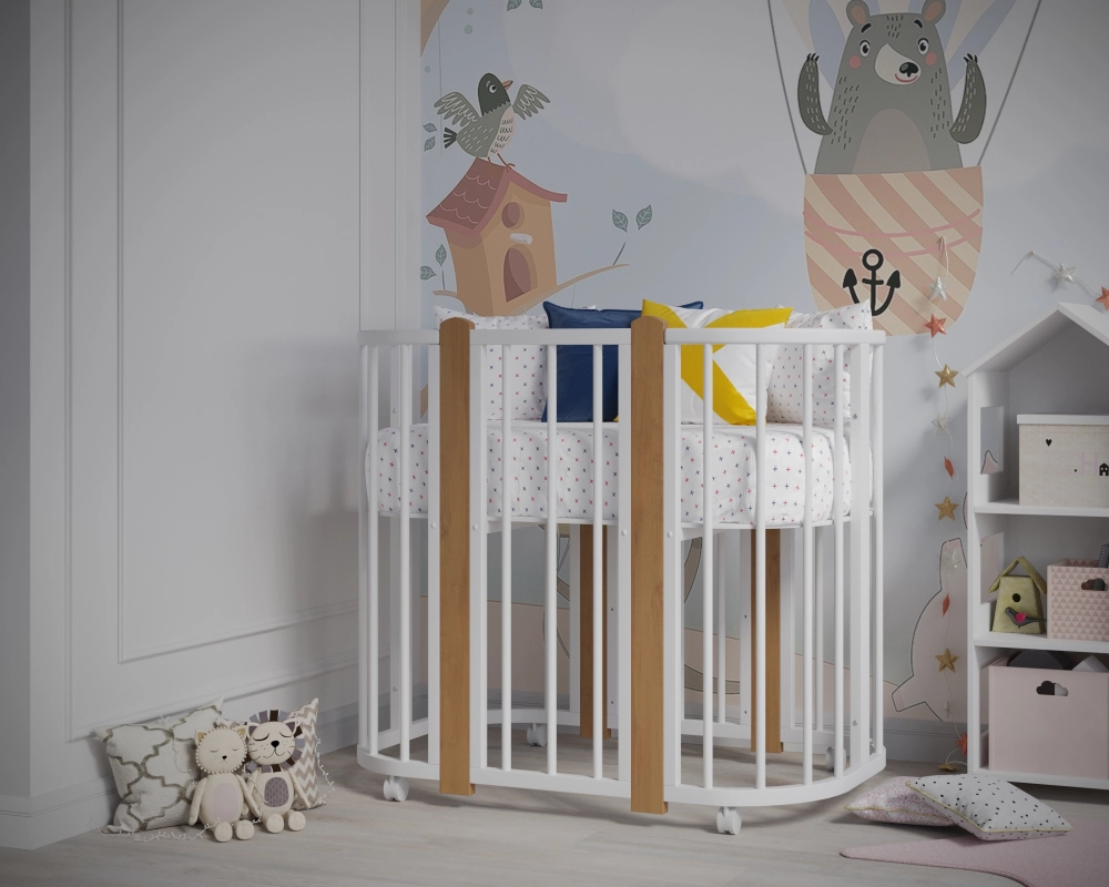 Новинка – уникальная детская кровать-колыбель с круглыми анатомическими ламелями, обеспечивающими комфорт малышу при развитии ручек. Размер люльки составляет оптимальные 84х60 см, легко проходит в любой стандарт дверного проема. Изготовлена из массива березы и твердого бука. Продуманная конструкция позволяет преобразовать ее сначала в детскую кроватку диаметром 120х60 см, а затем - в манеж и удобный диванчик!