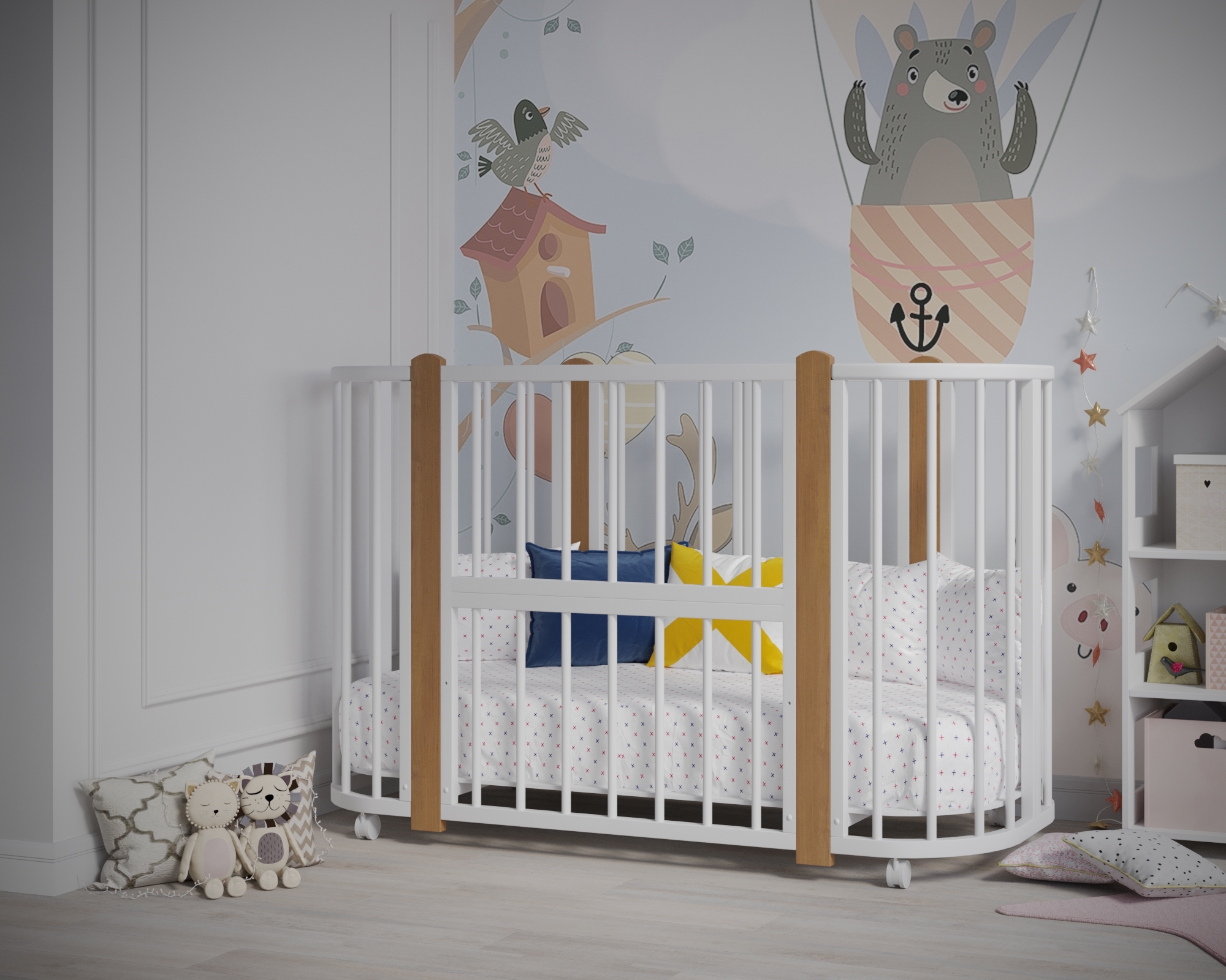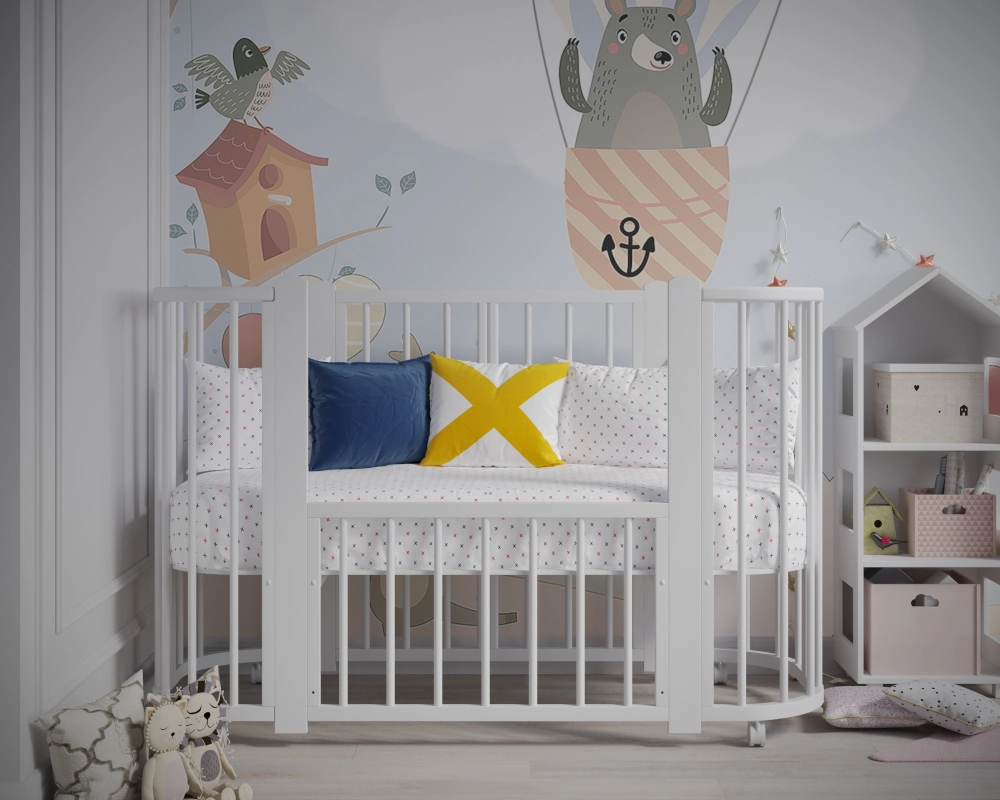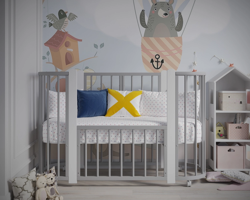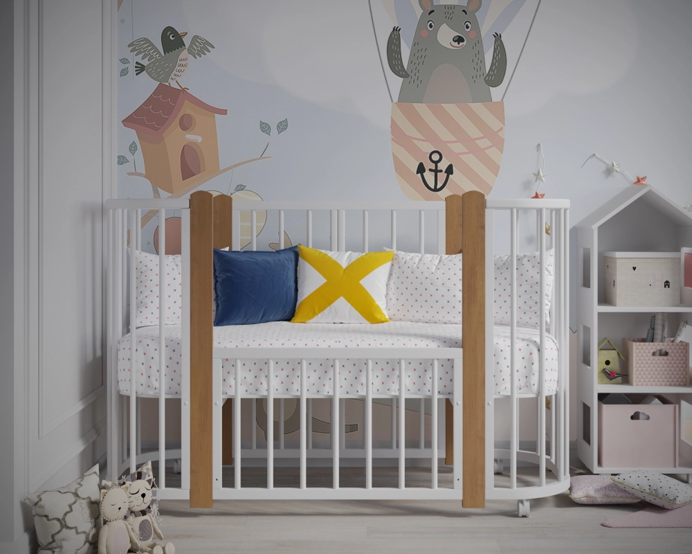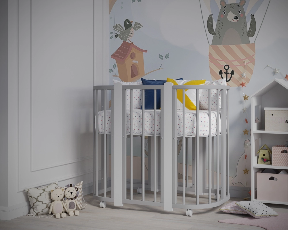 Новинка – уникальная детская кровать-колыбель с круглыми анатомическими ламелями, обеспечивающими комфорт малышу при развитии ручек. Размер люльки составляет оптимальные 84х60 см, легко проходит в любой стандарт дверного проема. Изготовлена из массива березы и твердого бука. Продуманная конструкция позволяет преобразовать ее сначала в детскую кроватку диаметром 120х60 см, а затем - в манеж и удобный диванчик!