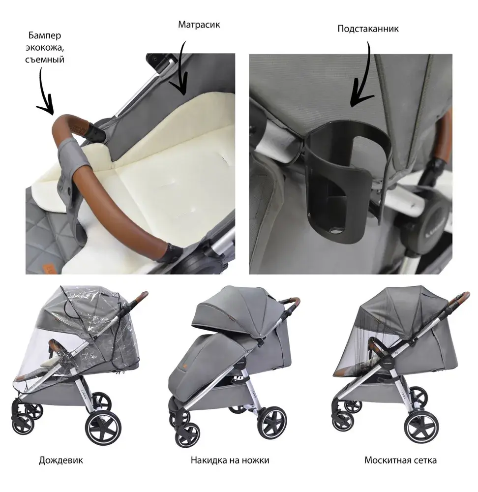 Комплектация: дождевик, москитная сетка, подстаканник, накидка на ножки, матрасик.