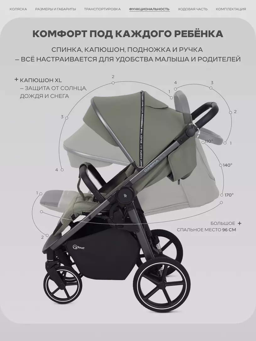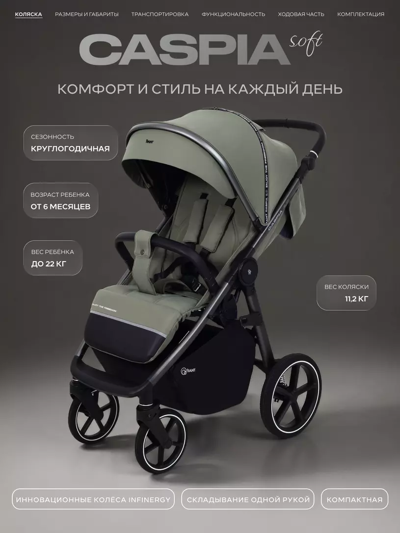 Детская прогулочная коляска RANT CASPIA SOFT- революционная модель для любого времени года! Благодаря уникальным колесам из материала E-TPU по технологии Infinergy и системе антишок SAS передние колеса обеспечивают непревзойденный комфорт хода. Регулируемая пружинная амортизация, уютная накидка на ножки и способность стоять вертикально в сложенном виде делают эту модель идеальным выбором как для жаркого лета, так и зимней стужи.