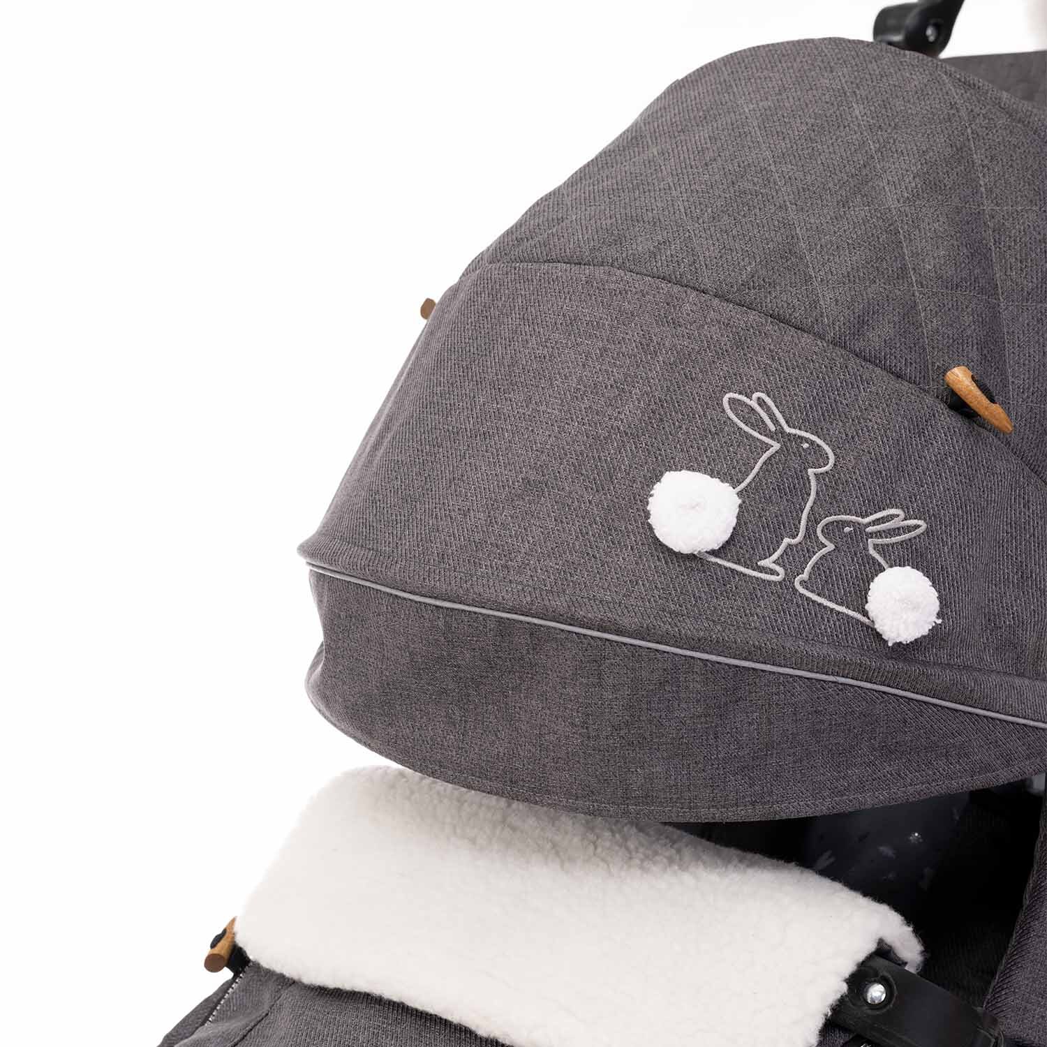 • Съемный  прозрачный тент от ветра и дождя, крепится к чехлу коляски на пуговицу