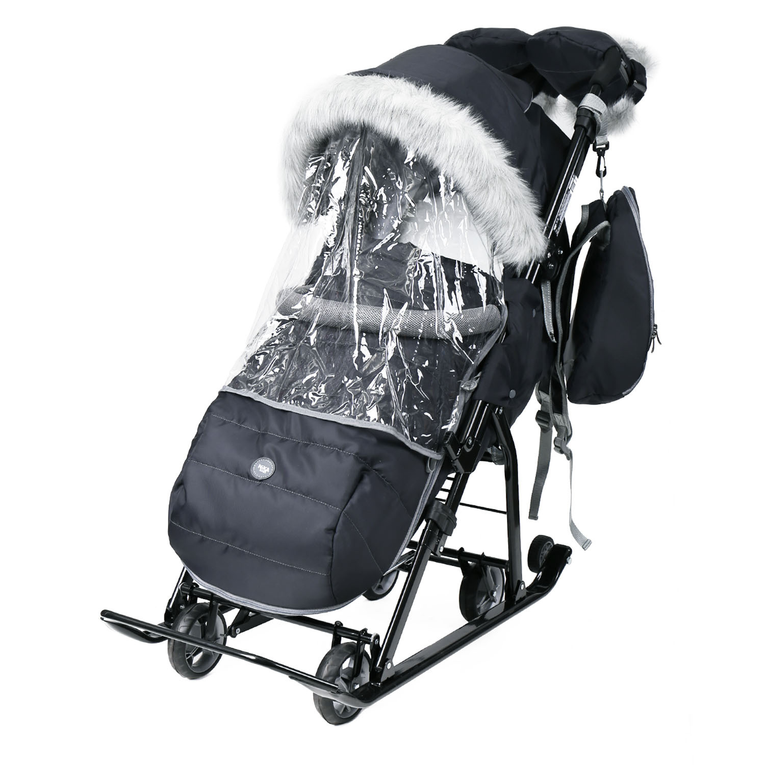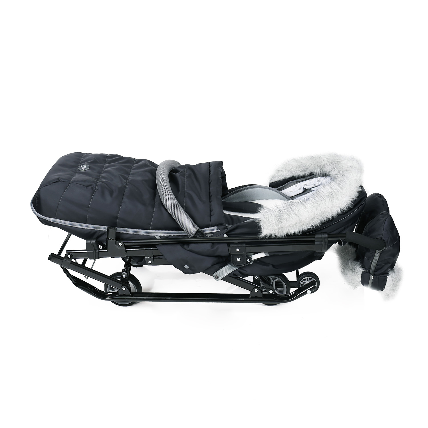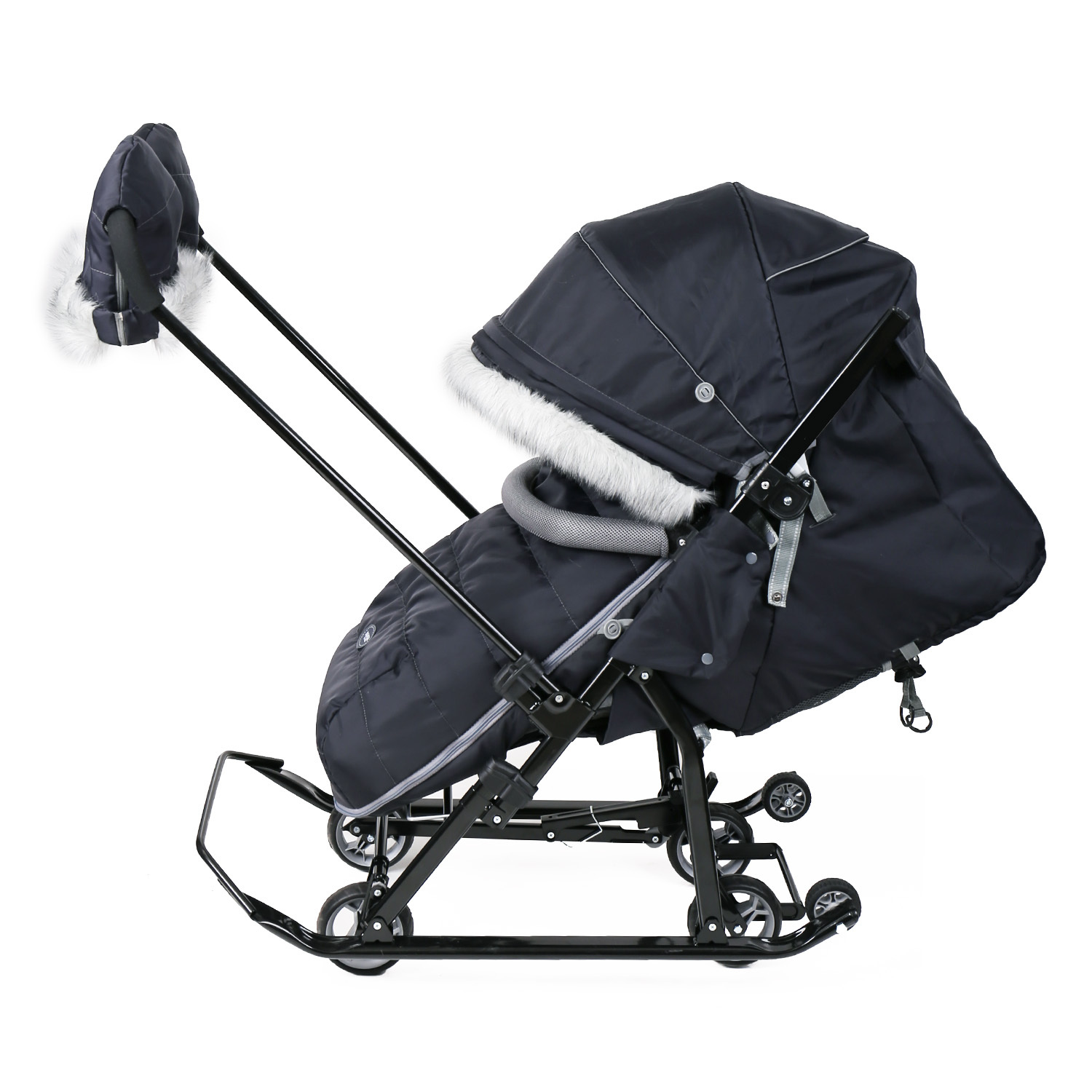 Широкие устойчивые полозья и выдвижные колеса обеспечат максимальную проходимость по асфальту и высоким рыхлым сугробам.