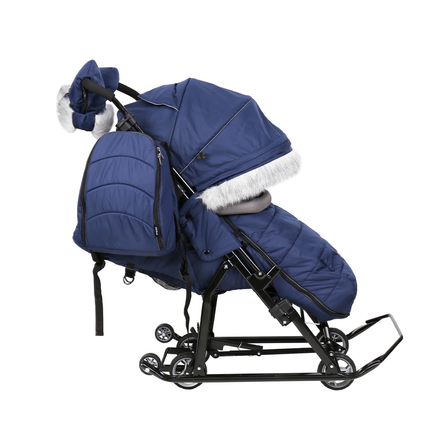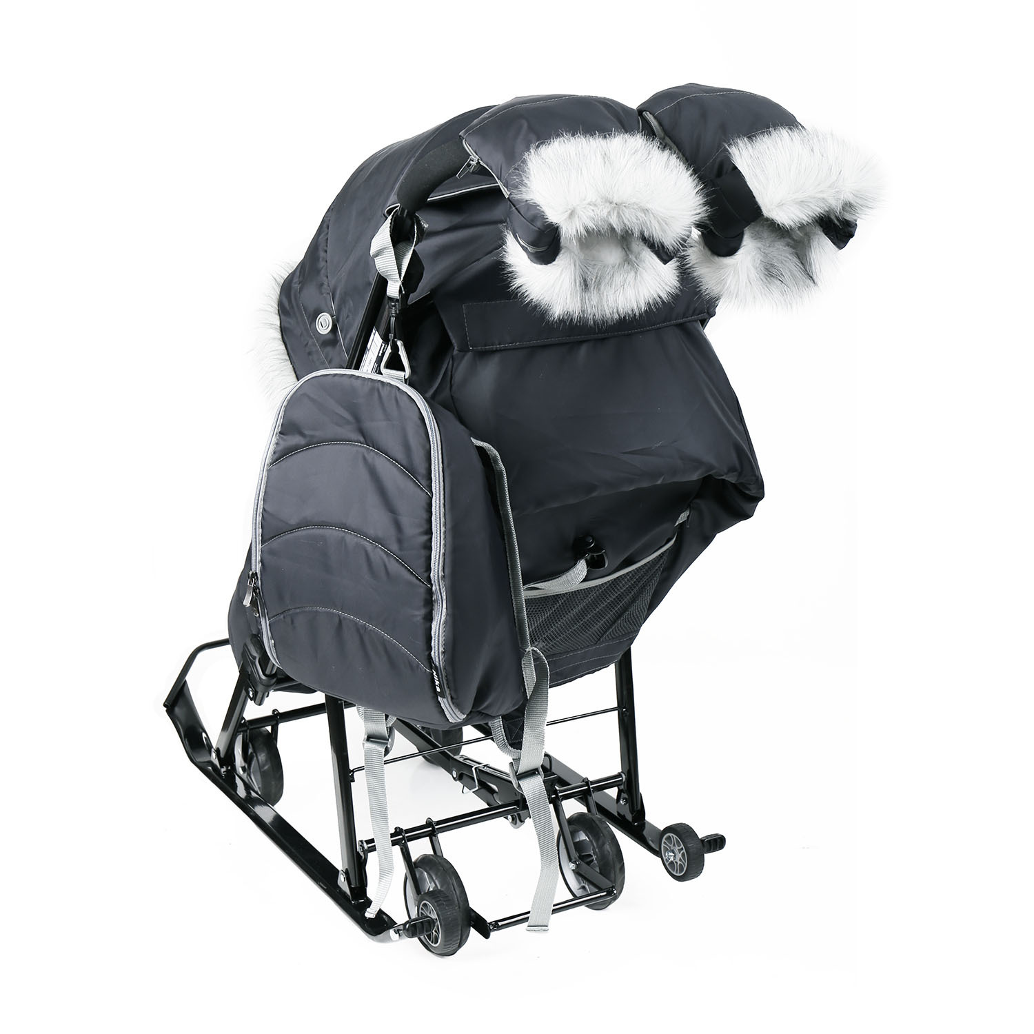 Новый крой чехла для ног со стежкой и окантовкой мехом, а также современный рюкзачок для необходимых вещей и мелочей на прогулке, который можно использовать как отдельный аксессуар.