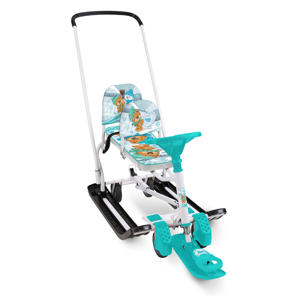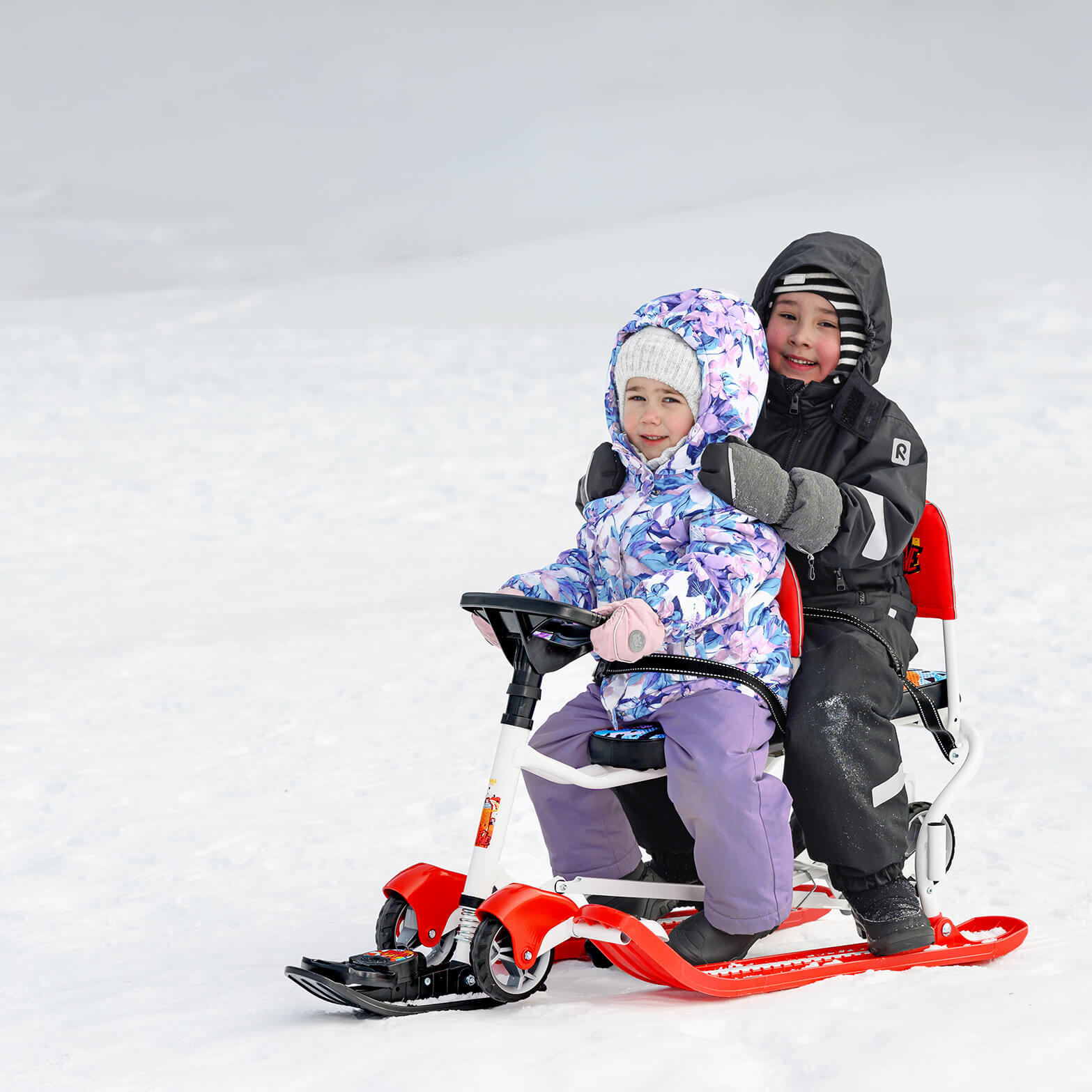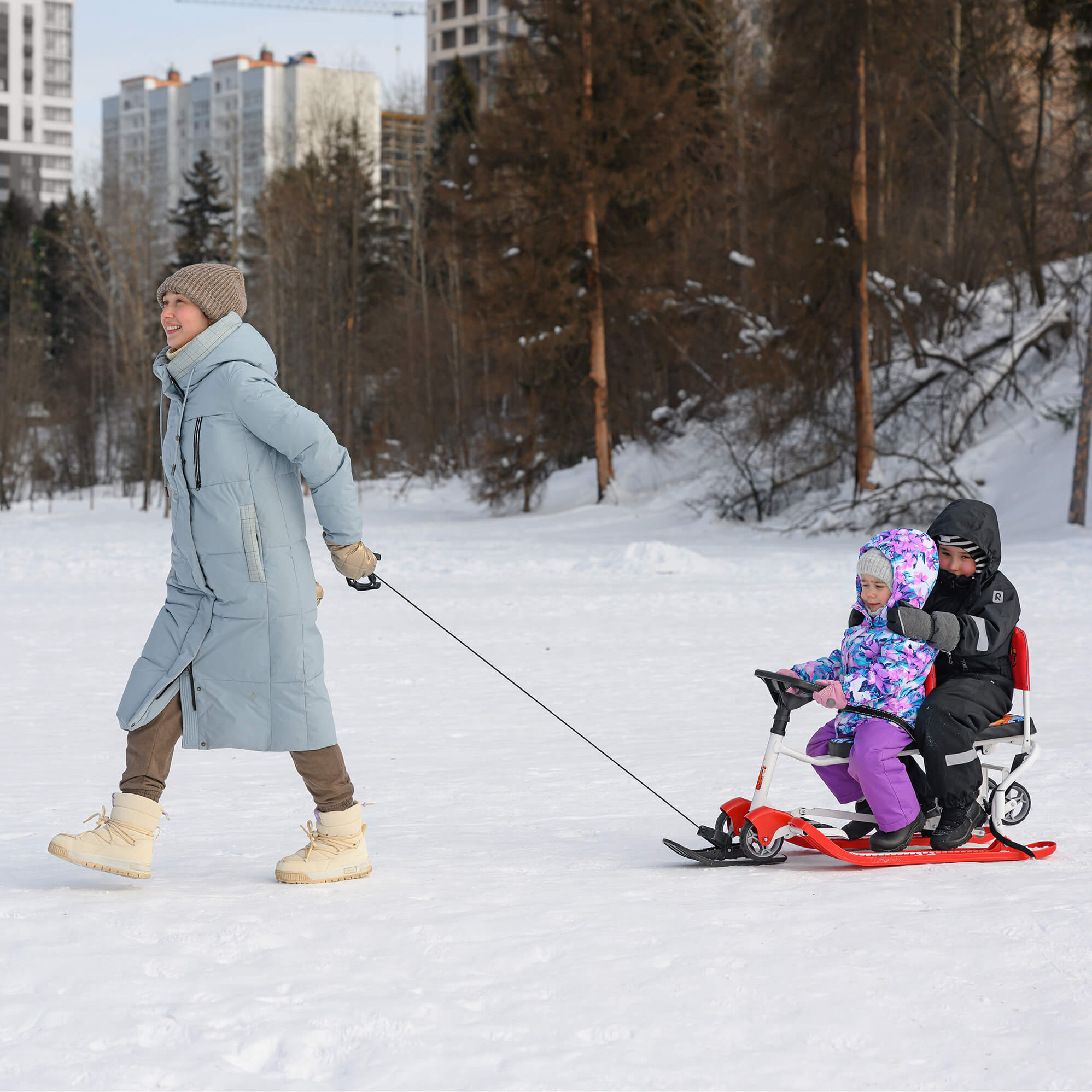 Снегокат с механизмом выдвижных шасси и родительской ручкой-толкателем для прогулок с двумя детьми от 3-х лет. Модель 2 в 1: колеса и полозья позволяют свободно передвигать снегокат по любой дороге.